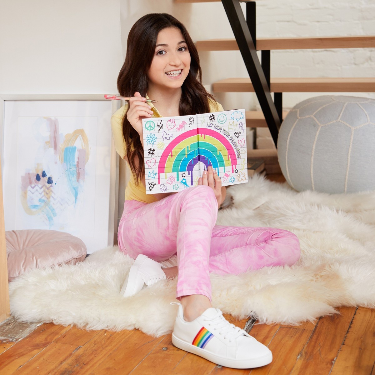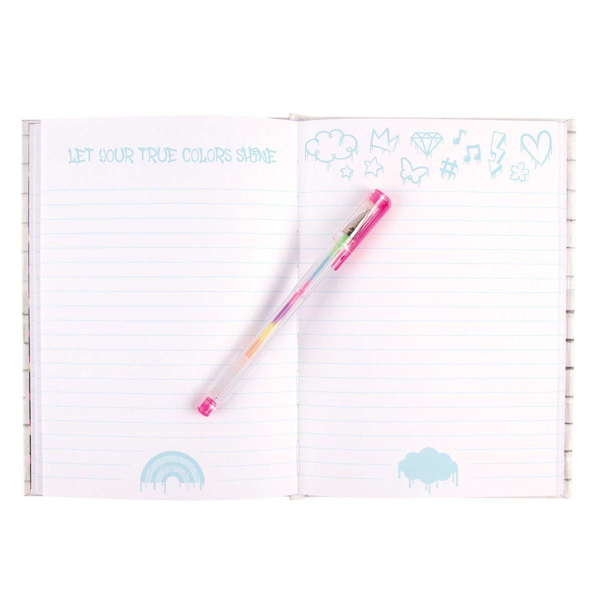 Želiš biti "trendy" sa ovim totalno cool dnevnikom? Raspršena duga na naslovnici, ukrašena led lampicama? Stisni veliki ukras desno dolje i neka lampice zasvjetle! Unutarnja strana korica preplavljena je dugama; 192 stranice sa linijama; dugina gel olovka! Set svijetli! Baterije su uključene u pakiranje i zamjenjive (unutarnja strana prednje korice).