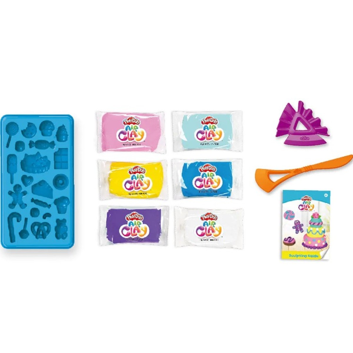 6 pakiranja Air Clay boja: ružičasta, žuta, svijetlo plava, tamnoplava, ljubičasta i bijela, 2 alata za oblikovanje, 1 plastična podloga s 21 kalupom za slastice, uključujući figuricu od medenjaka, tortu, perec i kolačić