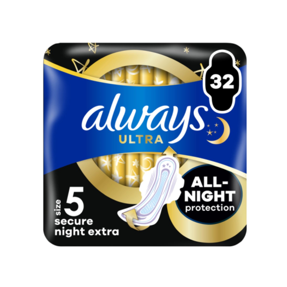 Ne pristajte na manje od neprekinutog sna uz uložak ALWAYS Ultra Secure Night Extra (veličina 5) s krilcima. Ovaj proizvod ima tri zaštitne značajke kako se noću ne biste morali buditi i provjeravati je li uložak propustio ili ga mijenjati. 9% duži prednji dio i 85% duži stražnji dio u kombinaciji s tehnologijom LeakGuard jamče cjelovitu, pouzdanu cjelonoćnu zaštitu od propuštanja za vrijeme mjesečnice. Sustav InstantDry upija tekućinu u nekoliko sekundi i drži vlažnost podalje od kože. Tehnologija OdourLock neutralizira neugodne mirise kako biste se osjećali svježe i čisto. Mirno spavajte, uz trostruku zaštitu uložaka ALWAYS Ultra. Dermatološki odobrilo udruženje Skin Health Alliance. Pronađite svoju idealnu veličinu pomoću sustava Always My Fit koji pomaže u odabiru prikladne veličine uloška za najbolju Alwaysovu zaštitu na temelju obilnosti mjesečnice i veličine gaćica.