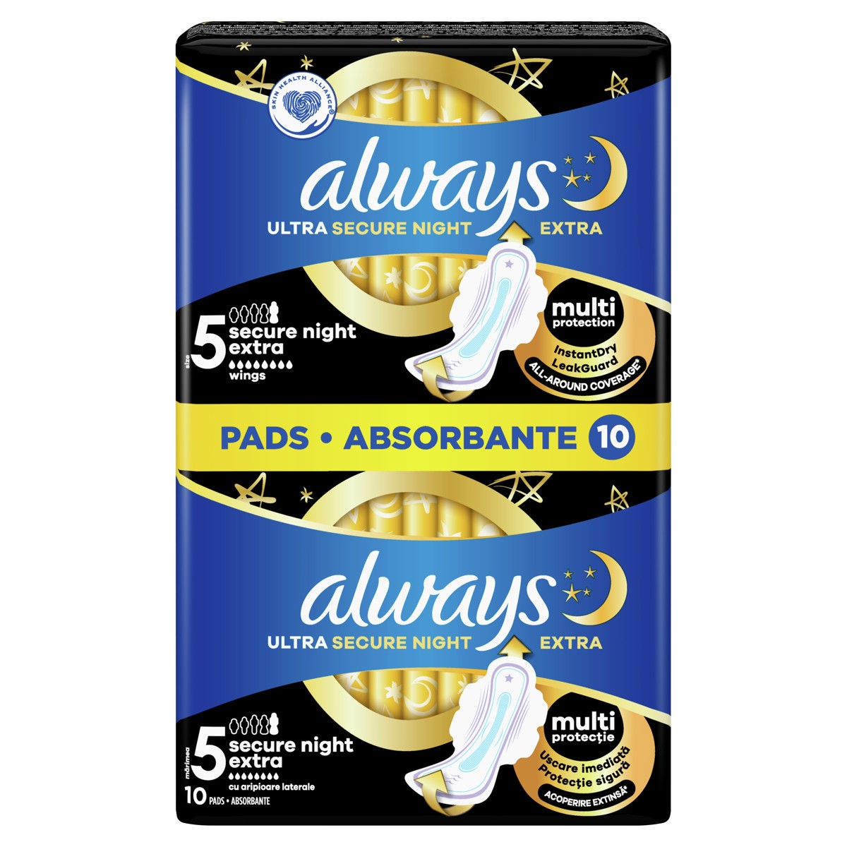Ne pristajte na manje od neprekinutog sna uz uložak ALWAYS Ultra Secure Night Extra (veličina 5) s krilcima. Ovaj proizvod ima tri zaštitne značajke kako se noću ne biste morali buditi i provjeravati je li uložak propustio ili ga mijenjati. 9% duži prednji dio i 85% duži stražnji dio u kombinaciji s tehnologijom LeakGuard jamče cjelovitu, pouzdanu cjelonoćnu zaštitu od propuštanja za vrijeme mjesečnice. Sustav InstantDry upija tekućinu u nekoliko sekundi i drži vlažnost podalje od kože. Tehnologija OdourLock neutralizira neugodne mirise kako biste se osjećali svježe i čisto. Mirno spavajte, uz trostruku zaštitu uložaka ALWAYS Ultra. Dermatološki odobrilo udruženje Skin Health Alliance.Pronađite svoju idealnu veličinu pomoću sustava Always My Fit koji pomaže u odabiru prikladne veličine uloška za najbolju Alwaysovu zaštitu na temelju obilnosti mjesečnice i veličine gaćica.