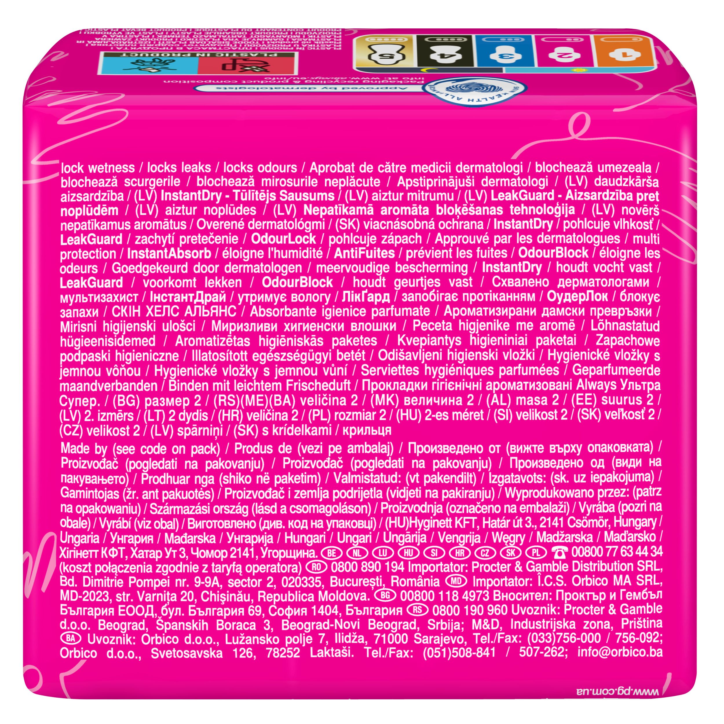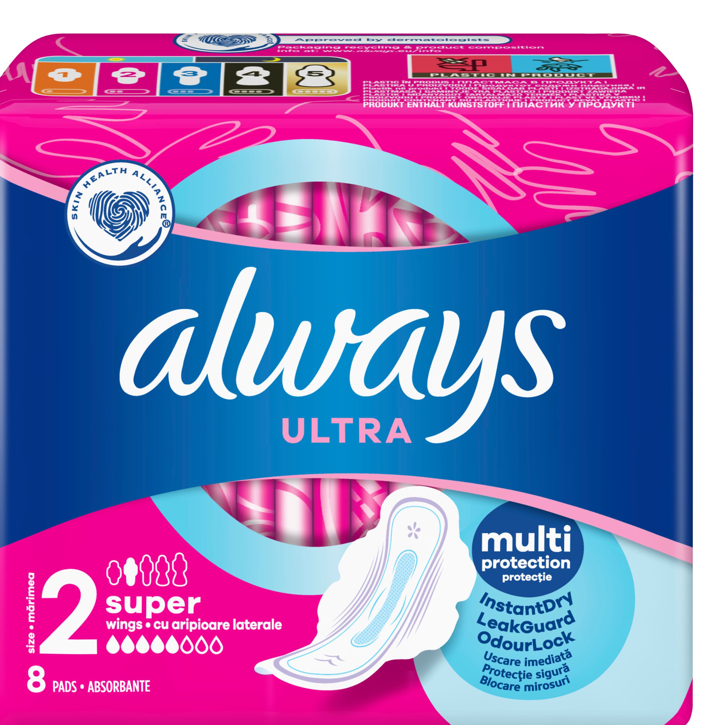 Sustav InstantDry upija tekućinu u nekoliko sekundi i drži vlažnost podalje od kože. Tehnologija LeakGuard zadržava tekućinu i pomaže spriječiti propuštanje. Tu je i tehnologija OdourLock koja neutralizira neugodne mirise kako biste se osjećali svježe i čisto tijekom mjesečnice. Uz Always Ultra možete se osjećati samopouzdano tijekom cijelog dana.