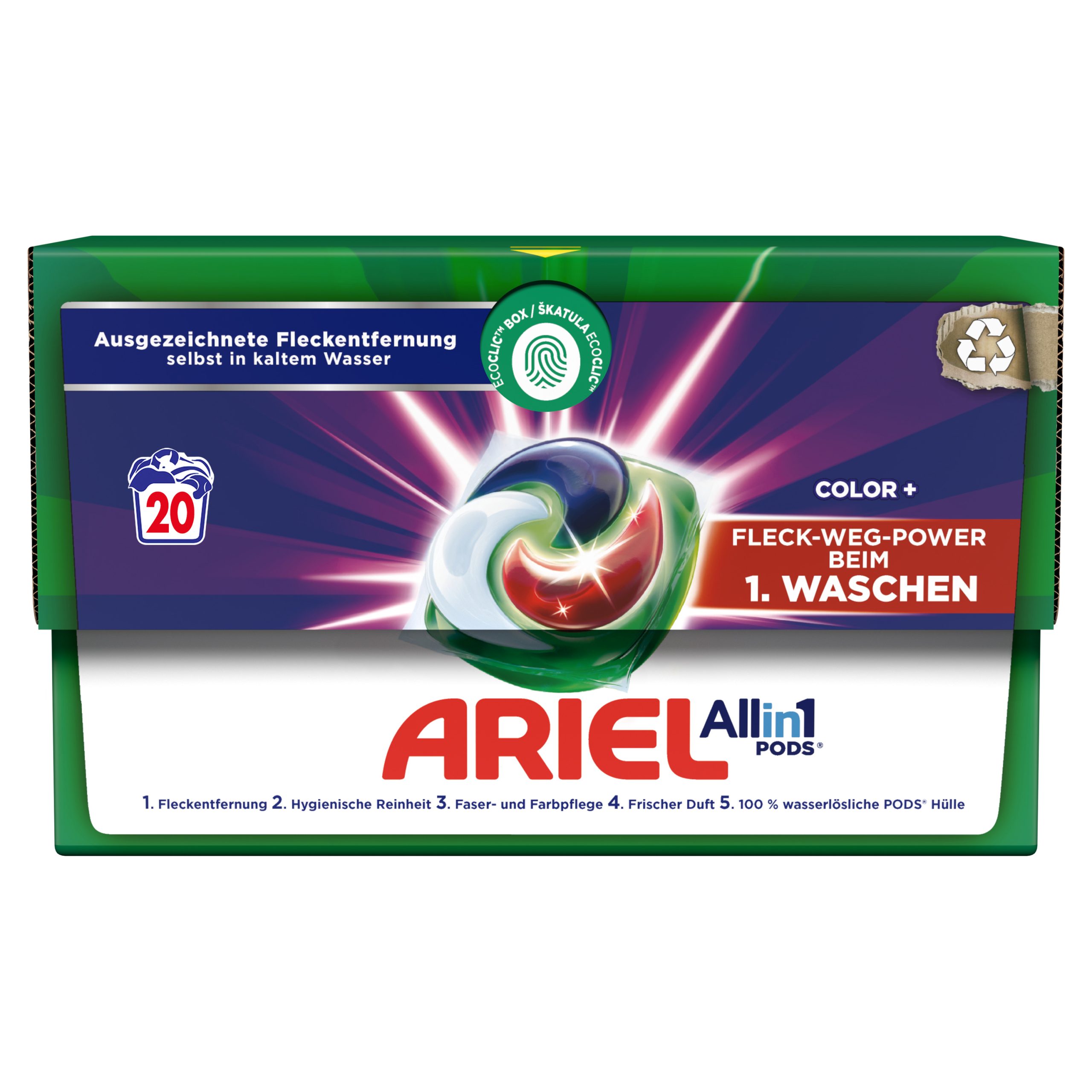 Štoviše, tablete za pranje Ariel sada mogu pridonijeti i smanjenju plastičnog otpada zahvaljujući kartonskoj kutiji ECOCLIC koja se može reciklirati! Sadrži maksimalno samo 5% plastike i osmišljena je za očuvanje kapsula PODS.
