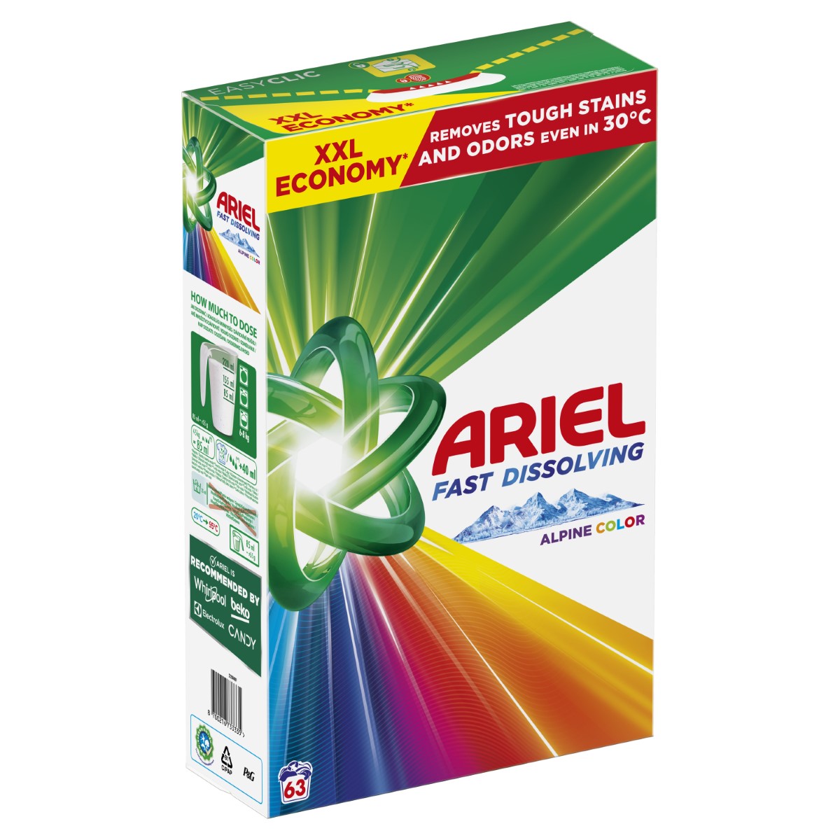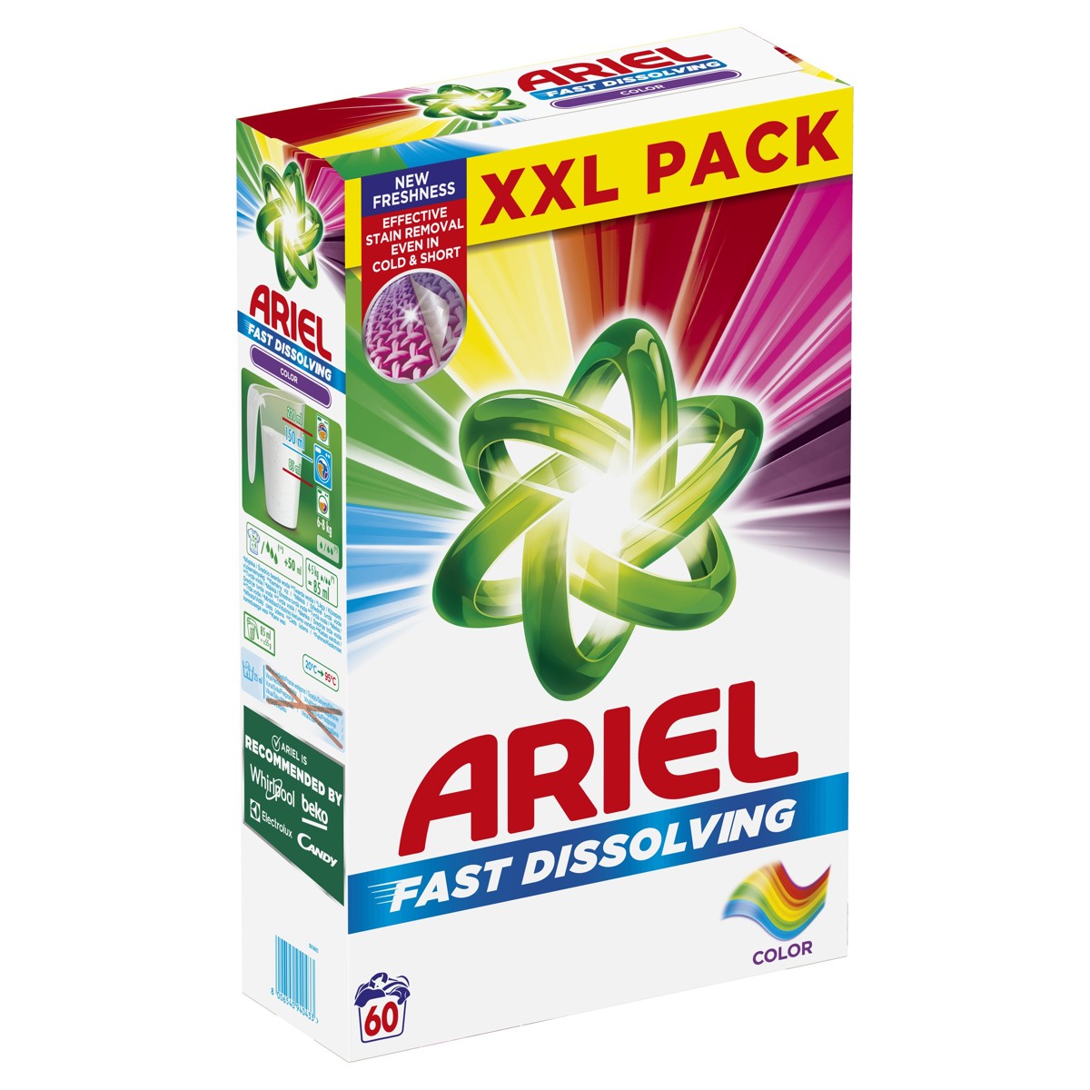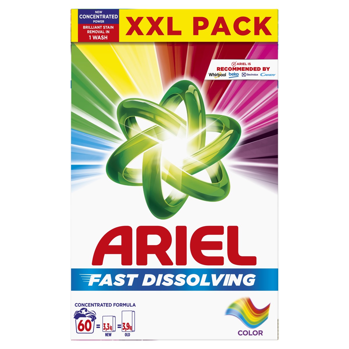 Ariel, marka koju preporučuju Whirlpool, Candy, Electrolux i Beko, predstavlja brzo topivi praškasti deterdžent za rublje Ariel Color. Sa svojom koncentriranom formulom praškasti deterdžent Ariel pruža koncentriraniju snagu i pere više rublja po gramu. Omogućuje briljantno uklanjanje mrlja u jednom pranju. Zahvaljujući jedinstvenoj tehnologiji brzo se otapa u dodiru s vodom, trenutno se aktivira i prodire duboko u vlakna čak i na niskim temperaturama pranja.
