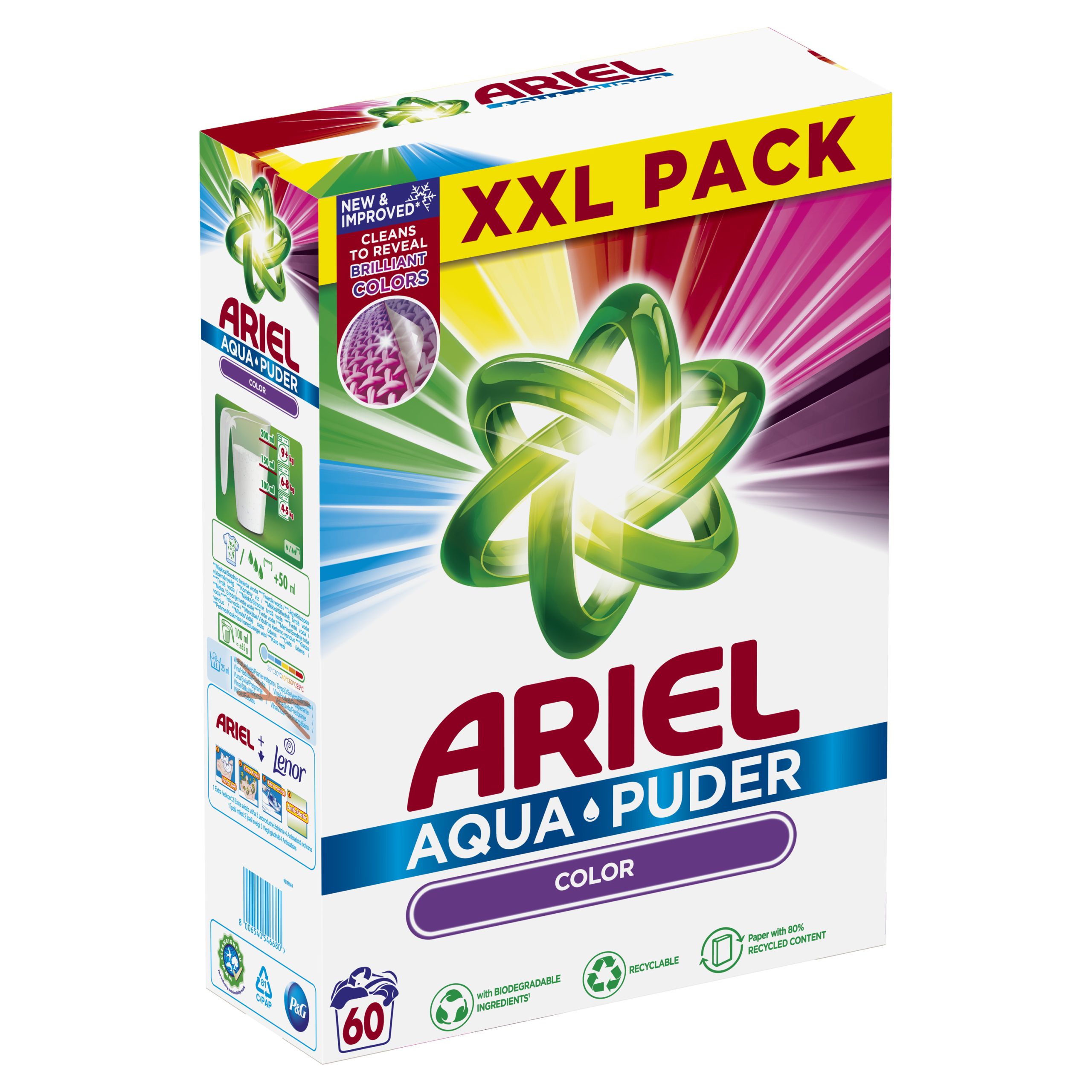 Ariel, Color, praškasti deterdžent, s tehnologijom protiv tragova deterdženta donosi blistavu Arielovu čistoću na nižim temperaturama pranja dok boje održava postojanima. Inovativna formula AquaPuder brzo se otapa u kontaktu s vodom, aktivira se u trenu i prodire duboko u vlakna za izvanrednu čistoću i blistave boje, čak i pri nižim temperaturama. Praškasti deterdžent Ariel uklanja tvrdokorne mrlje, čak i one od znoja i tjelesnih mirisa koje uzrokuju neugodne mirise. Njegova jedinstvena tehnologija protiv tragova deterdženta pomaže spriječiti zadržavanje tragova praška.