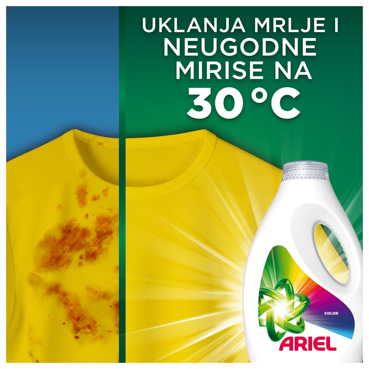 | Ariel, marka koju preporučuju Whirlpool, Candy, Beko i Electrolux, predstavlja tekući deterdžent za pranje rublja Ariel Color. Uklanja tvrdokorne mrlje i neugodne mirise, čak i na 30 °C. Njegova formula posebno je osmišljena za kratke programe pranja i pranje na nižim temperaturama. Tvrdokorne mrlje prije pranja tretirajte tekućim deterdžentom Ariel Color i njegovim zelenim čepom, a zatim operite rublje u perilici. Za najbolje rezultate čep s deterdžentom stavite izravno u bubanj perilice rublja. Iz ekoloških razloga na neke boce ne stavljamo čep s mjericom. Takav je čep besplatno dostupan na internetskoj stranici ariel.info. |