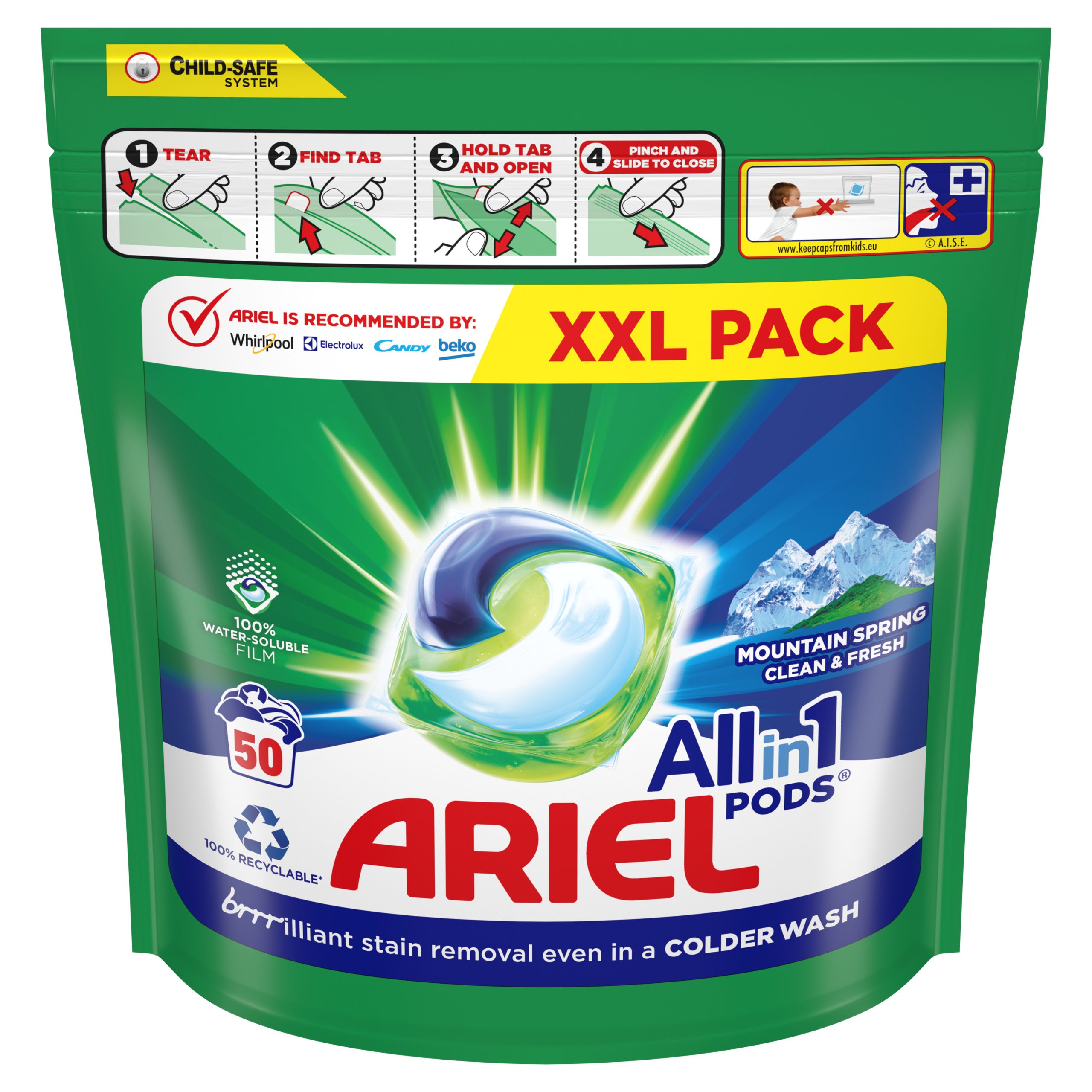 Osmišljene su za pranje na niskim temperaturama, s jedinstvenim tehnologijama poput tehnologije Cool Clean. U dodiru s vodom omot koji je 100% topiv u vodi rastapa se i oslobađa snažne tehnologije za uklanjanje mrlja, za dubinsko i snažno čišćenje kapsulama Ariel All-in-1 PODS Mountain Spring.