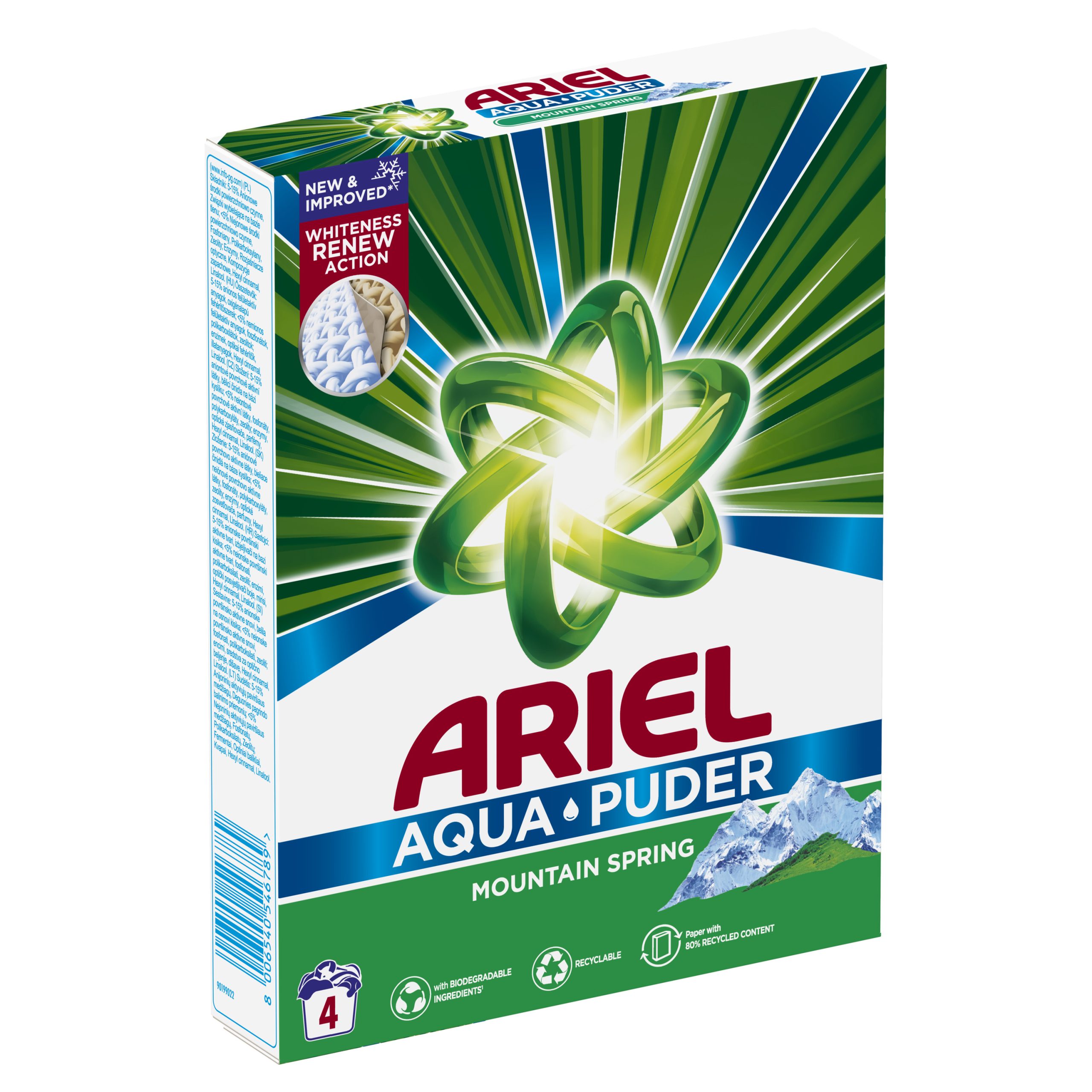 Osim toga, Ariel Mountain Spring dolazi u pakiranju koje se može reciklirati, a dostupan je i kao tekući deterdžent i u obliku kapsula.