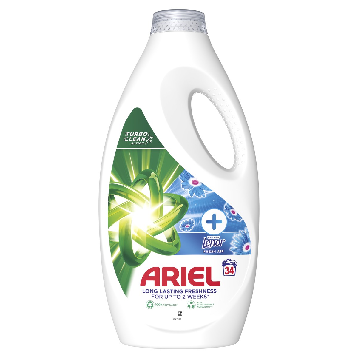 Tekući deterdžent Ariel +Touch of Lenor Fresh Air pruža besprijekorne rezultate na nižim temperaturama. Njegova je formula posebno osmišljena za brzo čišćenje, uz djelovanje TURBO CLEAN. Perite rublje na nižim temperaturama Arielovim tekućim deterdžentom: uštedite energiju pri svakom pranju i pritom smanjite emisiju CO₂. Usto, tekući deterdžent Ariel sadrži 80 % sastojaka organskog podrijetla koji su biorazgradivi i dolazi u pakiranju koje se može 100 % reciklirati.