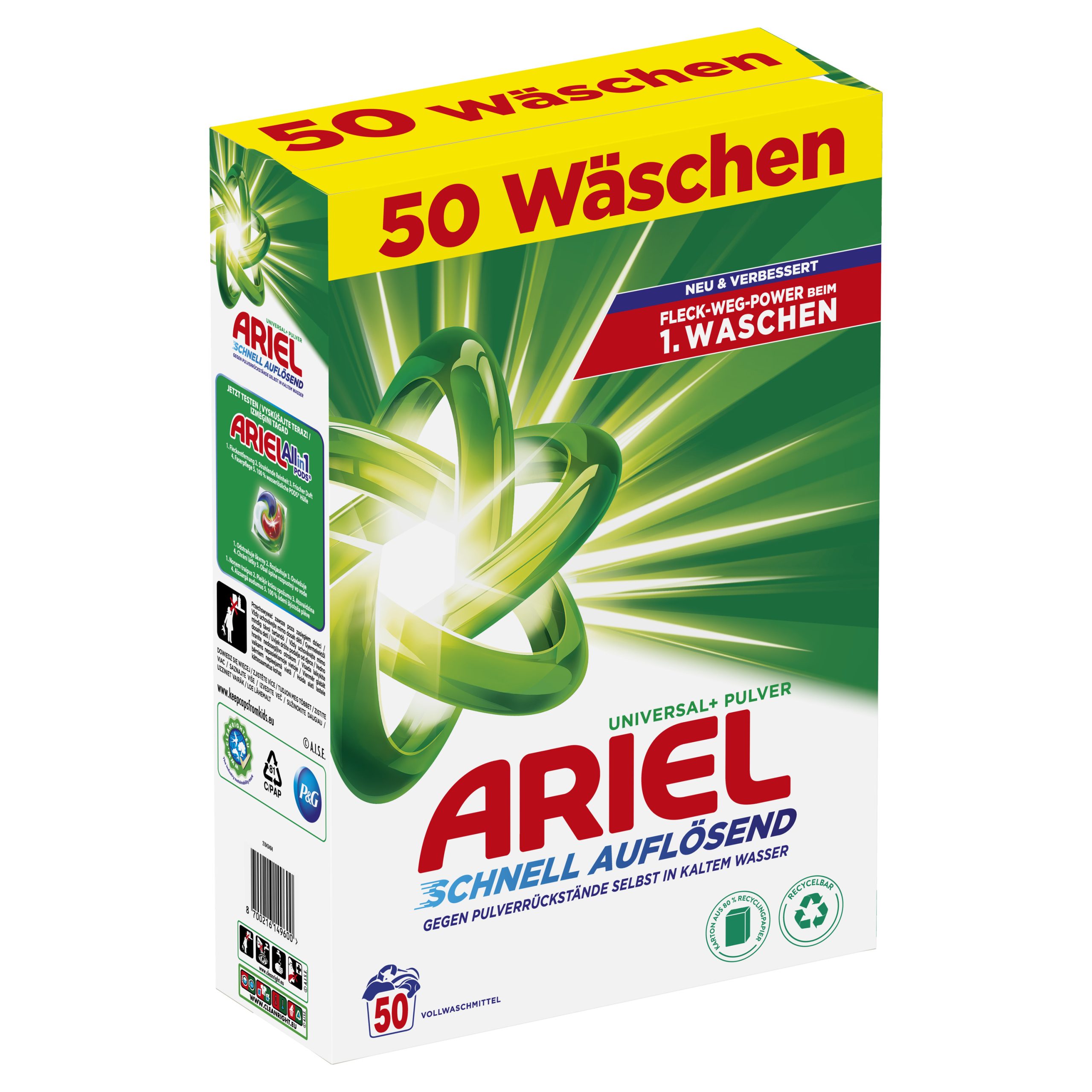 Ariel Universal+, praškasti deterdžent, u kombinaciji s tehnologijom protiv tragova deterdženta pruža blistavo Arielovo čišćenje na nižim temperaturama pranja. Njegova inovativna formula brzo se otapa u dodiru s vodom, aktivira u trenu i prodire duboko u vlakna donoseći izvanredno čišćenje čak i pri nižim temperaturama pranja.
