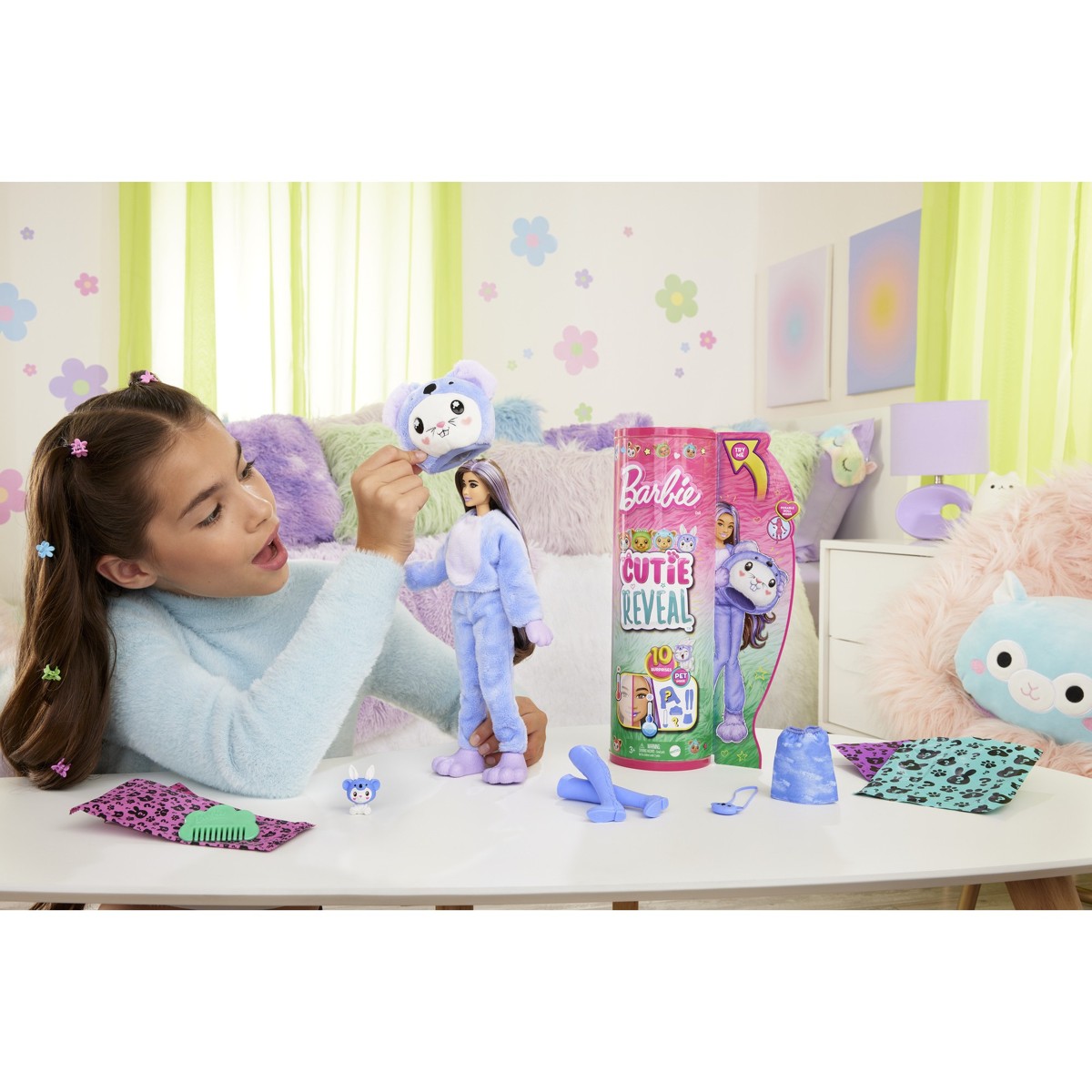 Barbie Cutie Reveal lutke s temom životinjskih kostima donose najslađe iskustvo raspakiranja uz 10 iznenađenja! Otkrijte zeca kao koalu. Skinite plišani kostim kako biste otkrili pokretljivu Barbie lutku s dugom, šarenom kosom. Otkrijte i dodatna iznenađenja poput para cipela, torbice i pripadajućeg mini ljubimca. Preokrenite plišani gornji dio kostima kako biste dobili jaknu od flisa, a glavu kostima preoblikujte u krevetić za ljubimca. Hladna voda donosi dodatnu slatkoću uz promjene boja na licu lutke i mini ljubimca, dok topla voda vraća originalni izgled za ponovnu zabavu! Djeca će uživati u otkrivanju — i skupljanju — svih simpatičnih iznenađenja u ovoj preslatkoj Barbie Cutie Reveal seriji. Sort proizvod, koju lutku ćeš dobiti? Lutke ne mogu samostalno stajati. Boje i ukrasi mogu varirati.