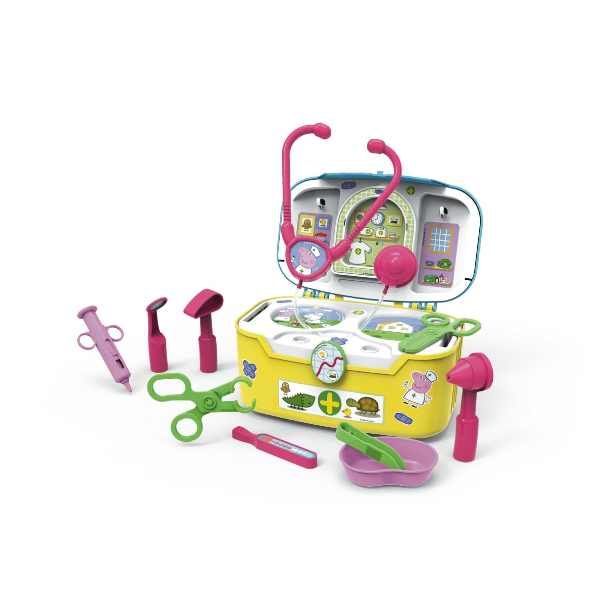Ovaj divni set za igru dolazi s 16 osnovnih dijelova, uključujući stetoskop, termometar, špricu i još mnogo toga, osiguravajući da vaš mališan ima sve što je potrebno za brigu o Peppi i njenim prijateljima.