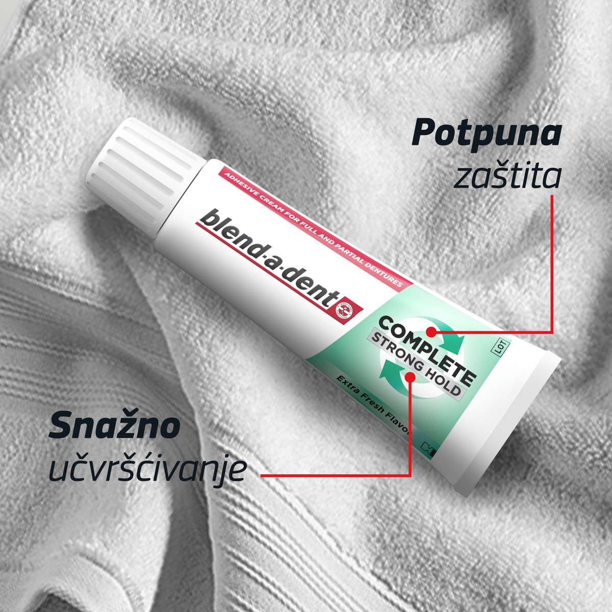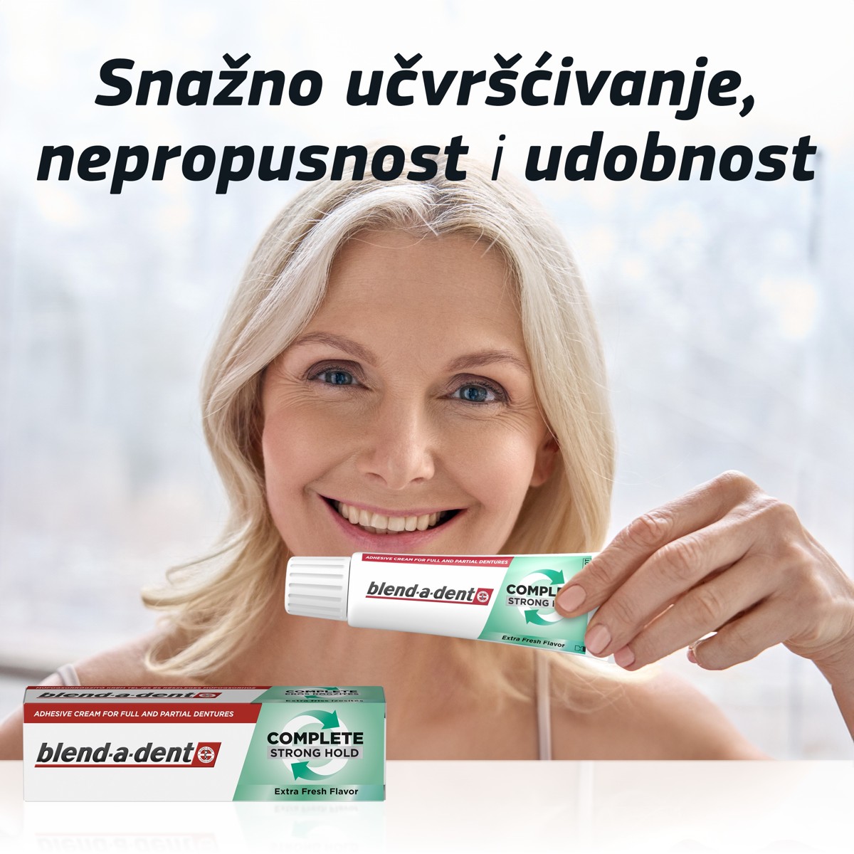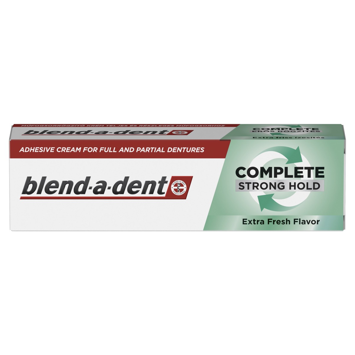 Krema za učvršćivanje zubnih proteza Blend-a-dent Complete izvrsno je rješenje ako ne želite stalno misliti o zubnoj protezi. Što god radili, što god jeli, uživat ćete u sigurnosti koju vam pruža pouzdano i udobno učvršćena zubna proteza, koja lijepo sjedi na svom mjestu. Blend-a-dent Complete čvrsto drži zubnu protezu tijekom dana i čini njezino nošenje ugodnjim tako što djeluje poput jastučića između desni i proteze te stvaranjem nepropusnog sloja pomaže spriječiti upadanje hrane ispod proteze. Sve to znači da se vi možete lijepo opustiti i potpuno uživati u svakom danu. Isprobajte ovu kremu sa svježim okusom metvice.