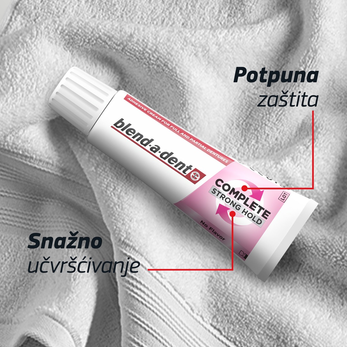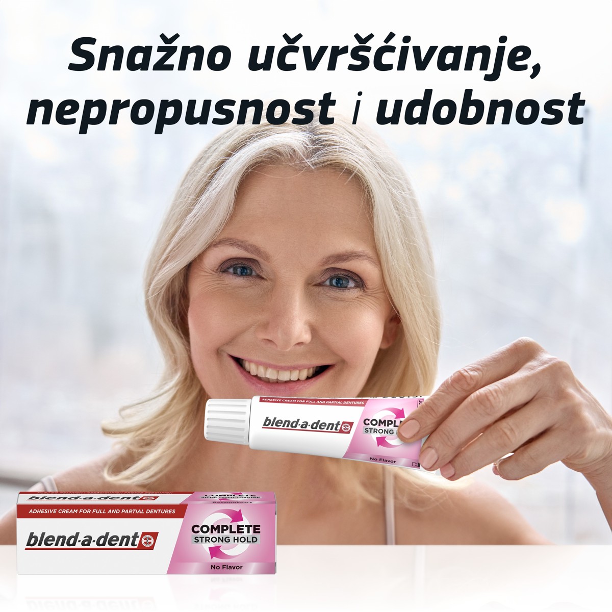 Što god radili, što god jeli, uživat ćete u sigurnosti koju vam pruža pouzdano i udobno učvršćena zubna proteza, koja lijepo sjedi na svom mjestu. Blend-a-dent Complete čvrsto drži zubnu protezu tijekom dana i čini njezino nošenje ugodnjim tako što djeluje poput jastučića između desni i proteze te stvaranjem nepropusnog sloja pomaže spriječiti upadanje hrane ispod proteze.