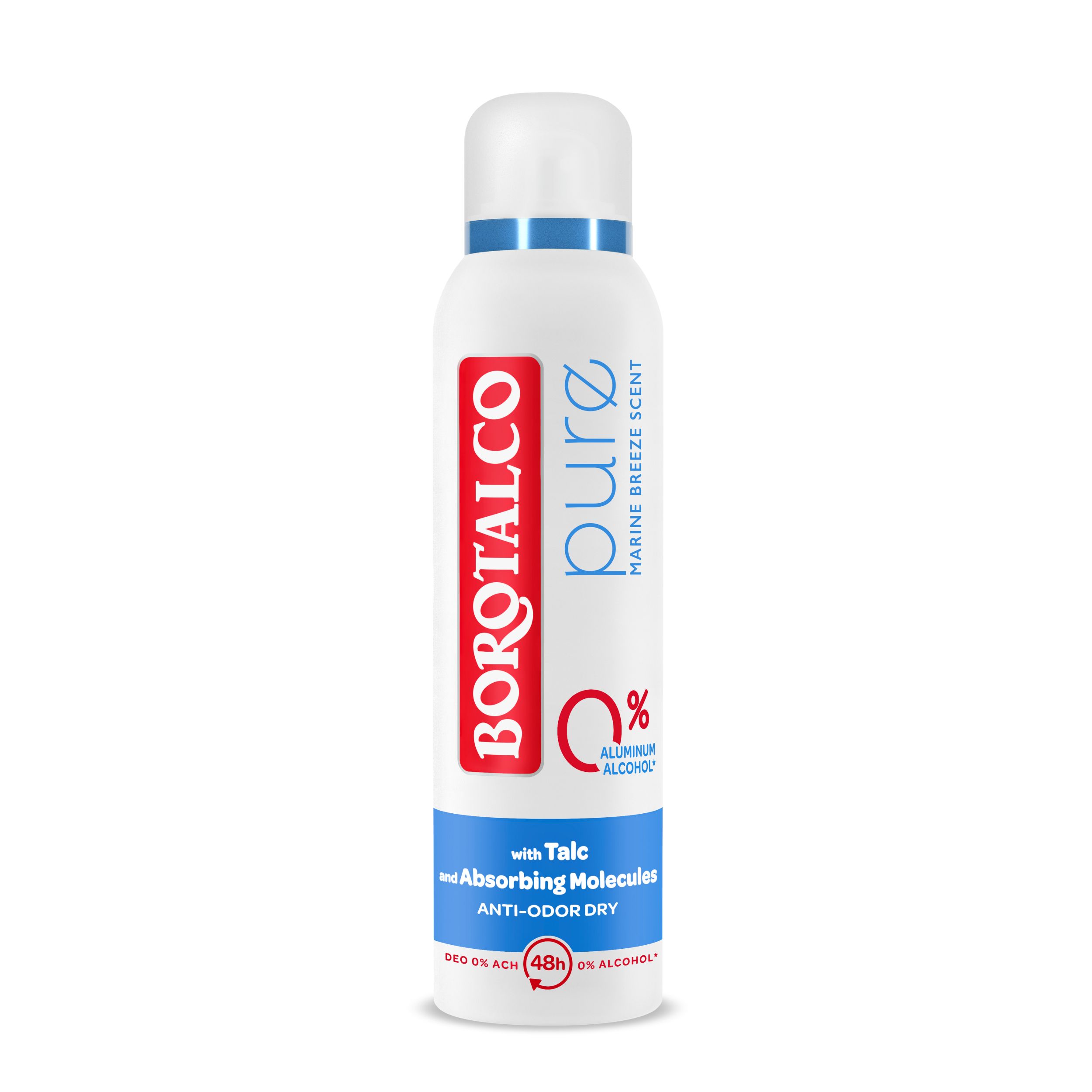 Borotalco Pure Marine Breeze dezodorans u spreju pruža dugotrajnu i učinkovitu zaštitu od znojenja i neugodnih mirisa. Ovaj miris svježa je kompozicija morskog srca i borovnice na puderastoj bazi. Borotalco Pure Marine Breeze dezodorans u spreju donosi inovativnu 0 % soli, 0 % alkohola* formulu obogaćenu talkom i upijajućim molekulama čiju suhu učinkovitost pospješuje spoj pudera cinka i tapioke. Za beskompromisni učinak protiv neugodnih mirisa. *Soli Aluminij Hidroklorida, Etanol