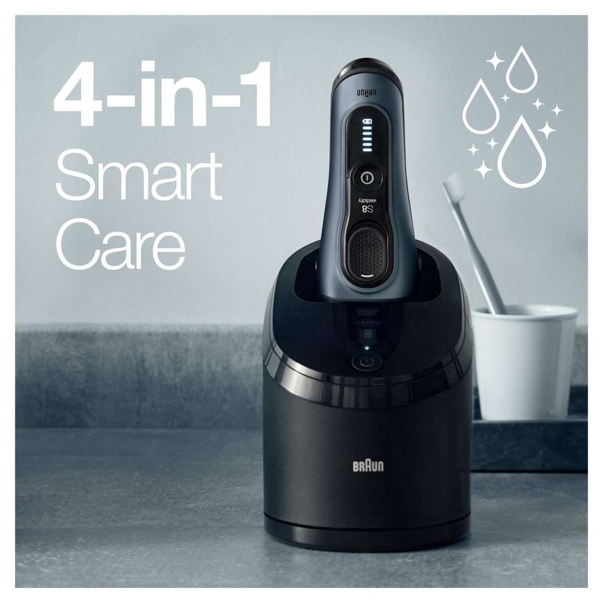 Otkrijte potpuno novu razinu brijanja uz Braun Series 8, električni brijaći aparat za muškarce koji pruža izuzetno moćno, ali i nježno brijanje. Kod njega je na djelu Braunova jedinstvena sonična tehnologija s 10.000 mikrovibracija koje pomažu uhvatiti više dlačica dok brijaći aparat lijepo klizi po koži. Tu je i glava prilagodljiva za 40° te fleksibilne oštrice koje se prilagođavaju konturama lica osiguravajući temeljito brijanje čak i na zahtjevnijim područjima. A jedinica 5-in-1 SmartCare Center brine o tome da brijaći aparat bude kao nov, svakoga dana.