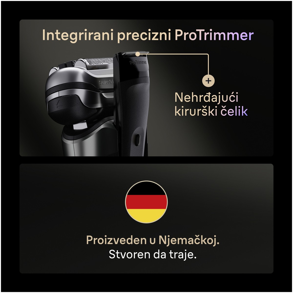 Series 9 PRO+ je 100% vodootporan, prikladan za mokro i suho brijanje, te je proizveden u Njemačkoj. Dolazi s postoljem za punjenje i 60-minutnom litij-ionskom baterijom.