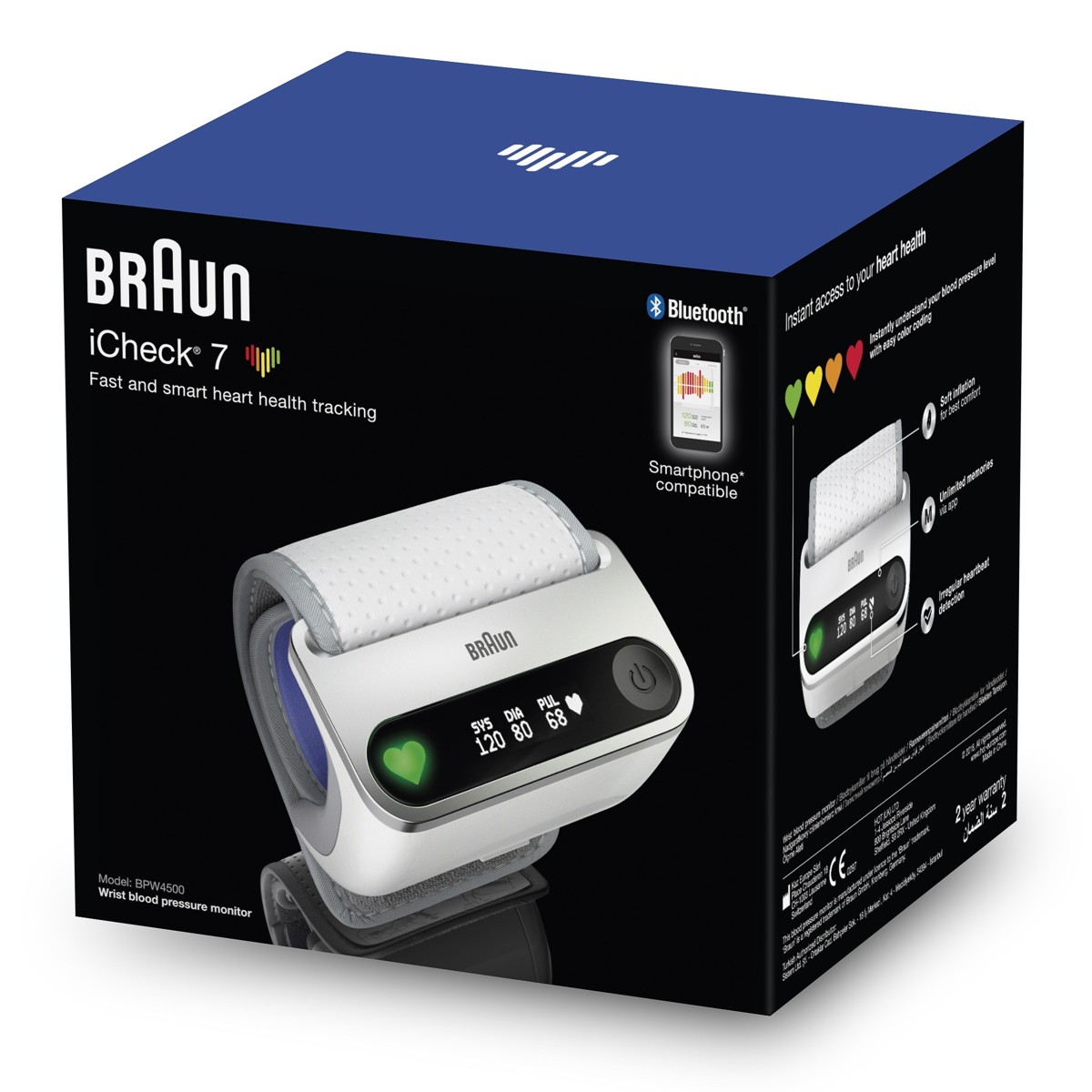 Braun iCheck 7 je nova generacija tlakomjera s jedinstvenim, intuitivnim i ultra tankim dizajnom. Sa svojim sustavom jednostavnog pozicioniranja ""loptica u rupi"", vodi vas prema ispravnom položaju ruke u razini srca, kako biste dobili najveću točnost. Na zaslonu dobivate trenutnu interpretaciju podataka o krvnom tlaku, temeljenu na smjernicama WHO-a.