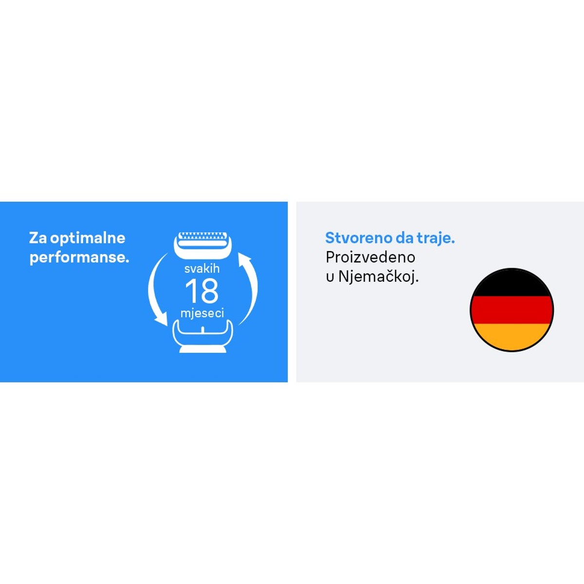 Ova ORIGINALNA zamjenska glava proizvedena je u Njemačkoj. Osigurava glatko i temeljito brijanje zahvaljujući 2 prianjajuće mrežice i središnjem trimeru. Posebna tehnologija mrežice je nježna prema koži i štiti je od posjekotina i ogrebotina.