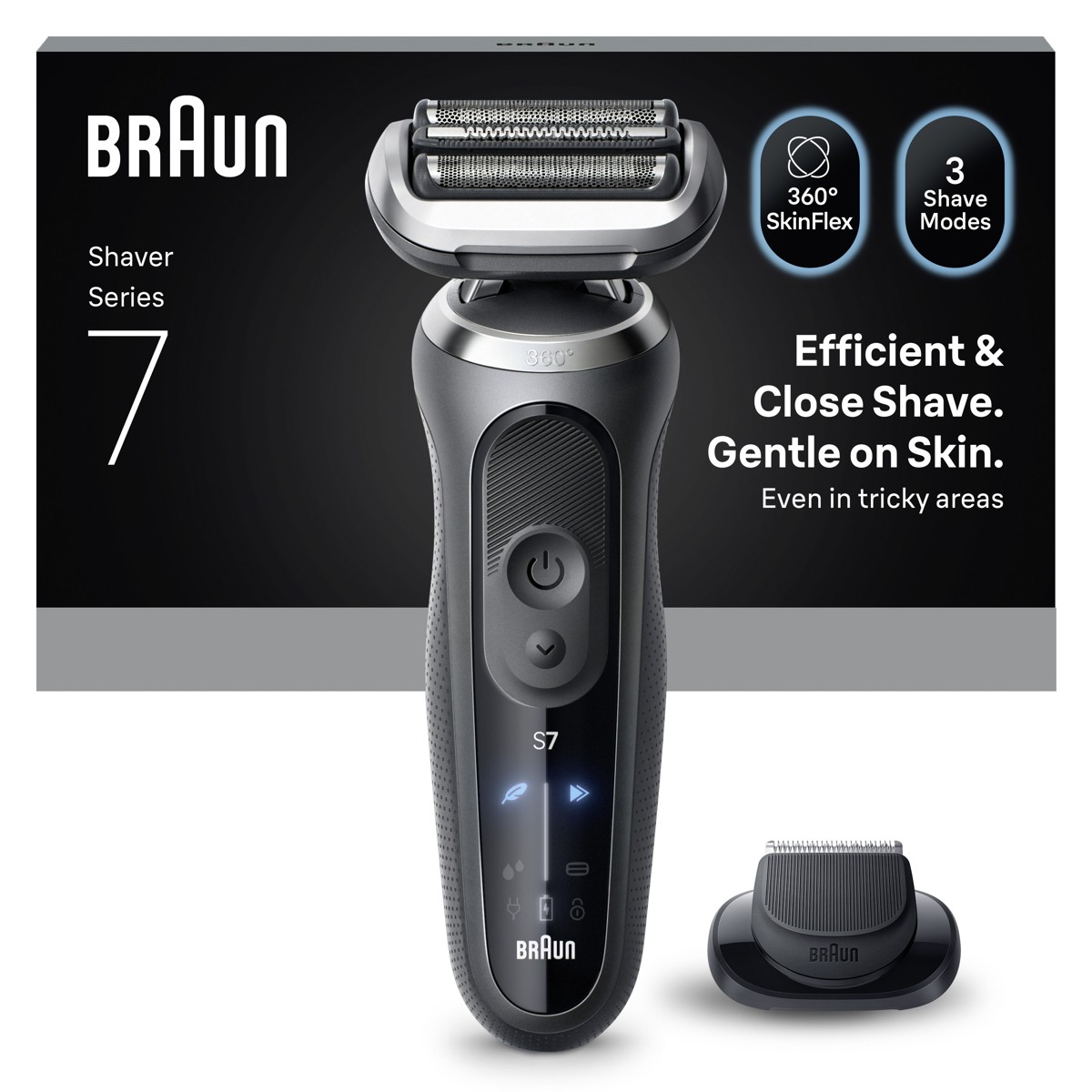 Brijaći aparat za muškarce Braun Series 7 pruža temeljitije i brže brijanje nego ikad prije, a pritom je nježan prema koži*. Glava 360° SkinFlex i 3 fleksibilne oštrice prilagođavaju se konturama vašeg lica za ultra glatko brijanje, čak i na zahtjevnim područjima.
