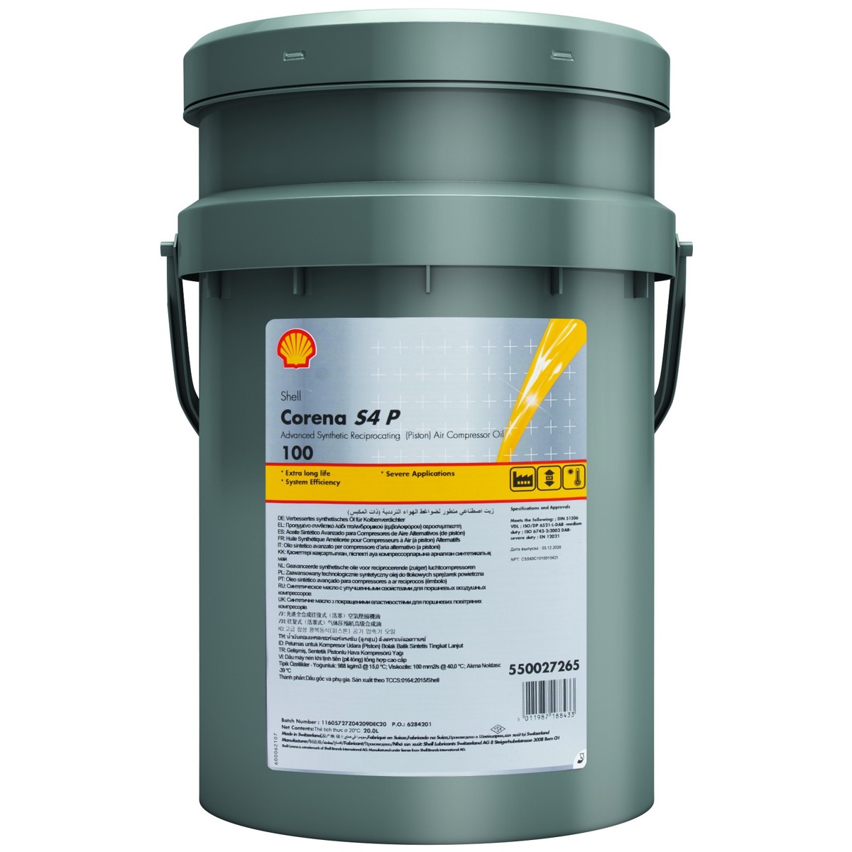 Shell Corena S4 P je vrhunsko sintetičko ulje za zračne kompresore, koje sadrži sintetička esterska bazna ulja i posebne aditive za visoke performanse. Dizajnirano je kako bi pružilo vrhunske performanse podmazivanja klipnih zračnih kompresora čije temperature ispuha premašuju 220°C pri visokim tlakovima. Ovo ulje pruža sigurno, pouzdano i učinkovito podmazivanje za produljeni servisni interval gdje ulja na mineralnoj bazi ne zadovoljavaju.