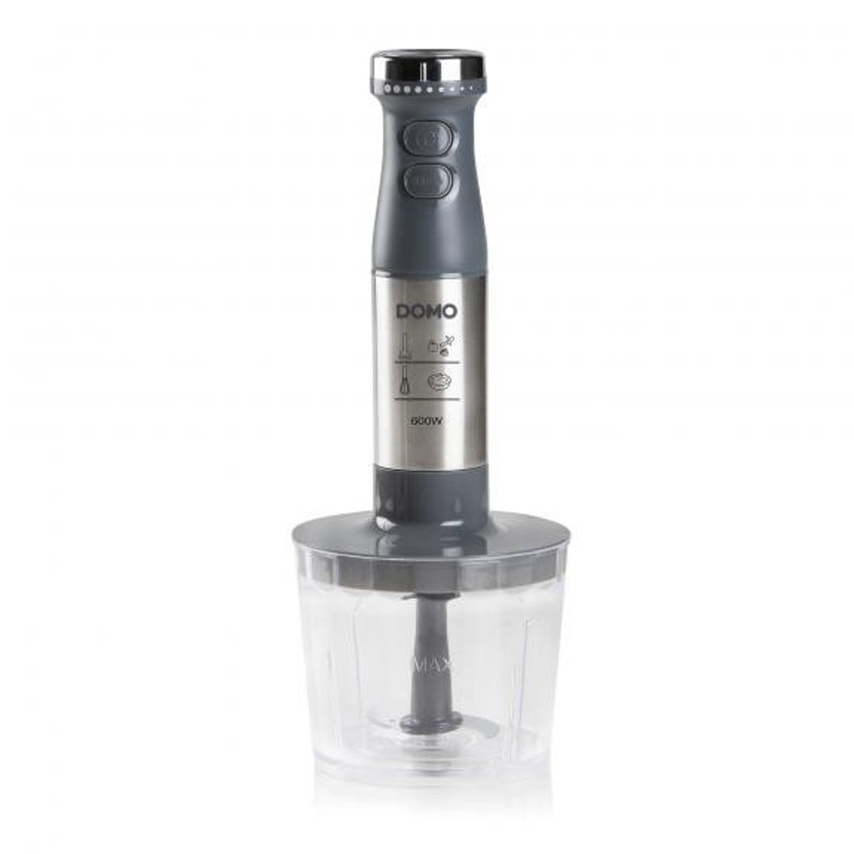 Domo štapni mikser DO9226M u elegantnom i ergonomskom dizajnu izrađen je od nehrđajućeg čelika i ima snagu od 600 W. Set uključuje mikser, pjenjaču od nehrđajućeg čelika, sjeckalicu za hranu s vrlo oštrim noževima i mjernu čašu.