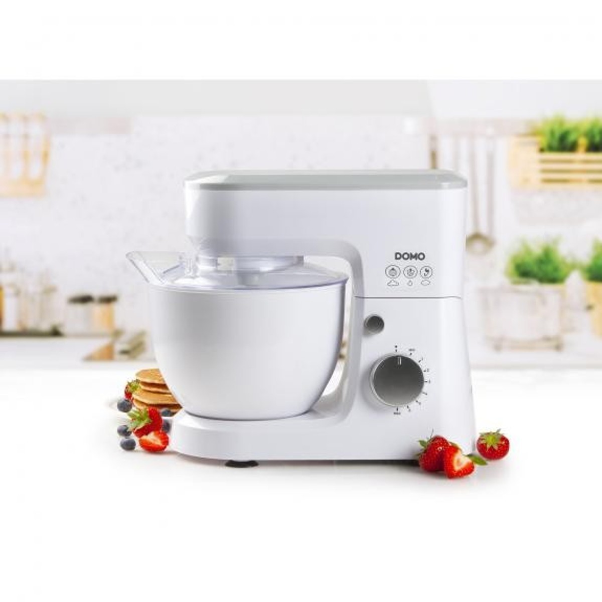 S Domo DO9241KR možete podesiti željenu brzinu miješanja prema vrsti pripreme sa 6 postavki. Kuhinjski stroj uključuje 3 različita nastavka. Kukica za tijesto može se koristiti za miješanje tijesta za kolače. S pjenjačom možete brzo umutite bjelanjke za meringue ili slatko vrhnje. Zahvaljujući prozirnom poklopcu protiv prskanja, možete pratiti proces miješanja i spriječiti da sadržaj zaprlja vaš pult.