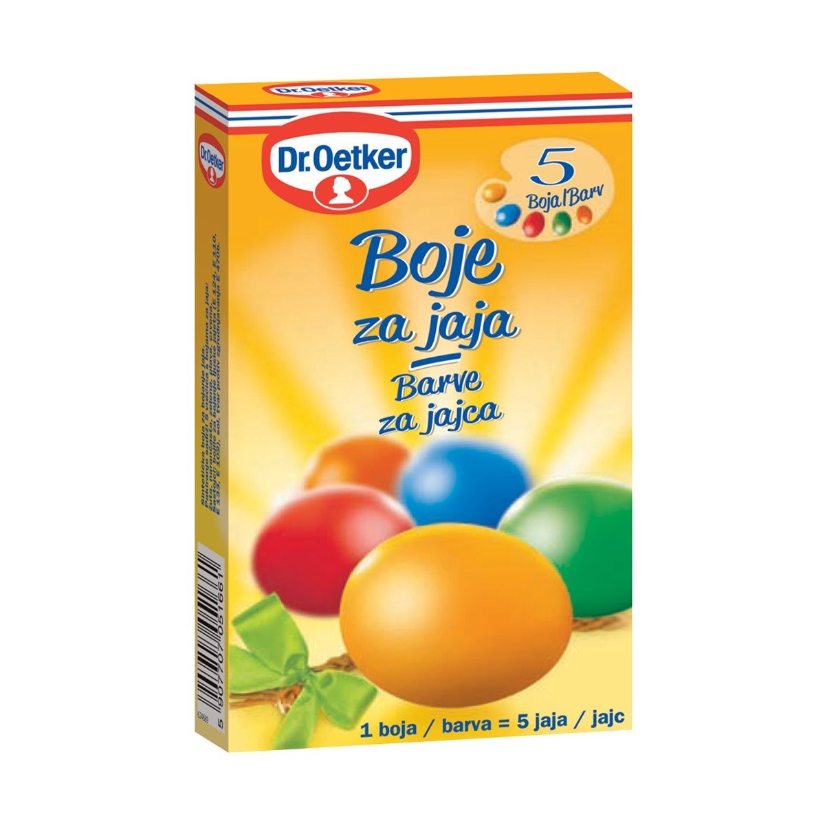Pomoću Dr. Oetker boje za jaja napravite najljepše i najšarenije pisanice za vaš uskrsni stol ili košaru. U pakiranju se nalazi 5 različitih boja: žuta. narančasta, plava, zelena, crvena. Jedna boja dovoljna je za bojanje 5 jaja.