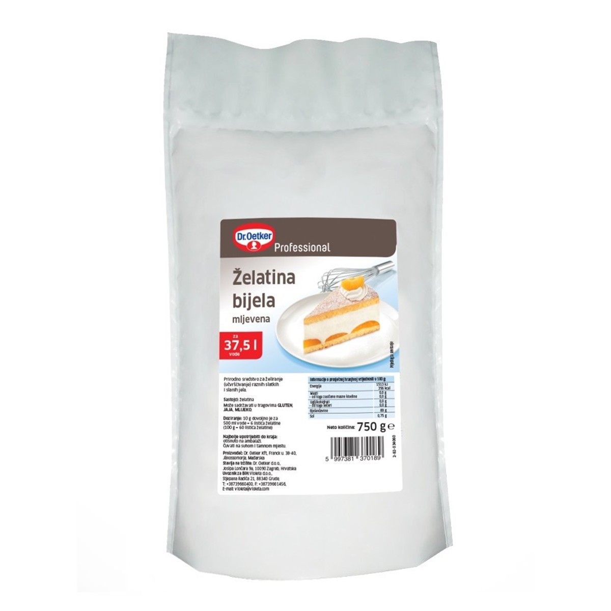 Prirodno sredstvo za želiranje (učvršćivanje) kremastih nadjeva za torte i kolače, krema i želatinastih slatkih i slanih jela. Doziranje: 10 g dovoljno je za 500 ml vode = 6 listića želatine (100 g = 60 listića želatine). Dr. Oetker je usmjeren premašiti Vaša očekivanja – bilo da se radi o praktičnim veličinama pakiranja, visokom stupnju lakoće pripreme ili širokoj paleti visoko kvalitetnih proizvoda. Dugu tradiciju, ljubav i strast prema slasticama te prije svega Dr. Oetker kvalitetu prepoznale su generacije potrošača, a upravo slogan Kvaliteta je najbolji recept to i potvrđuje! Vrhunska Dr. Oetker kvaliteta dodataka i dekora za kolače u pakiranju za profesilonalnu upotrebu! Kvalitetna, stabilna i praktična ambalaža- čuva proizvod tijekom skladištenja do sljedeće uporabe! Zaokruženi paket proizvoda- točno ono što slastičaru treba!