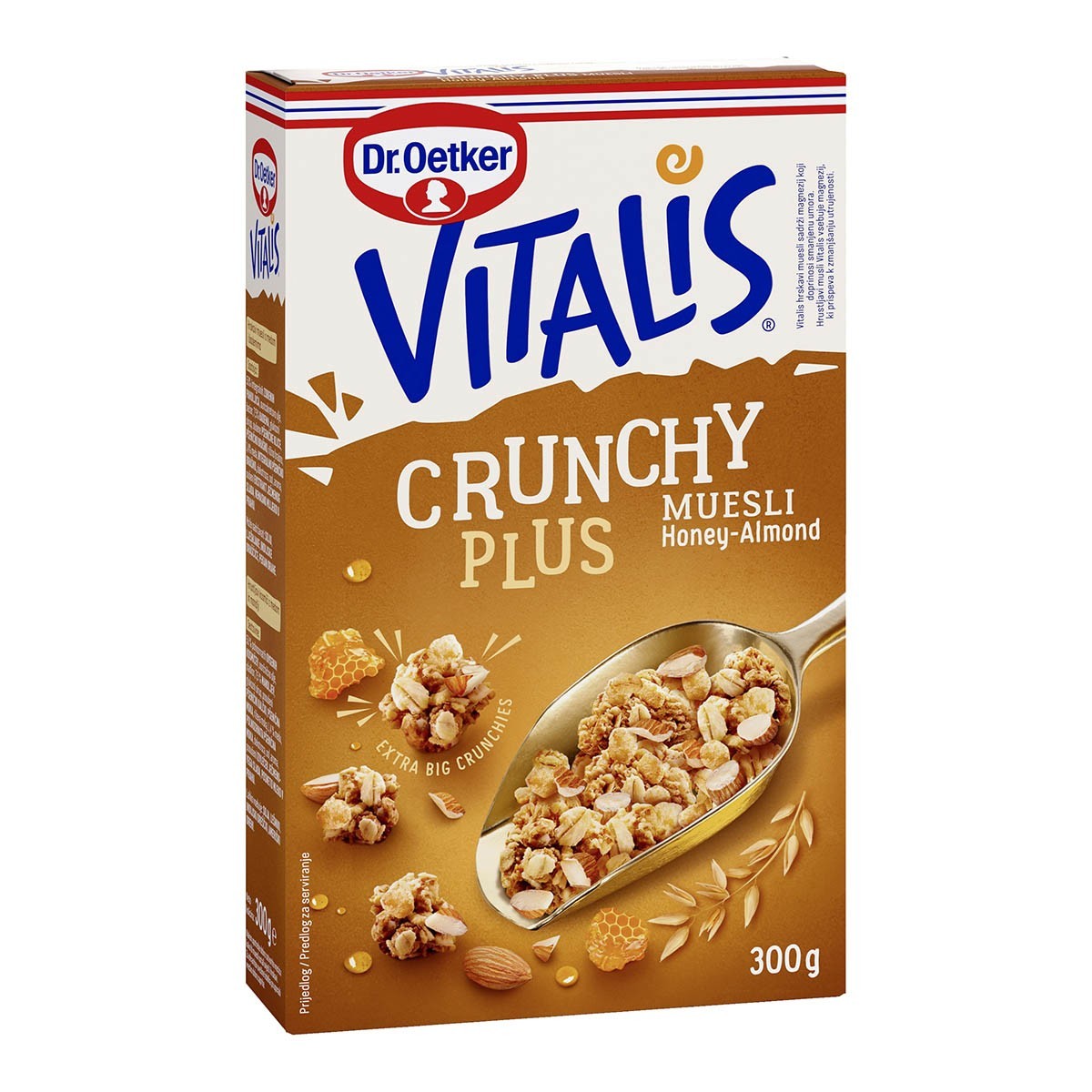 U Vitalis Crunchy Plus Med-Badem zlatno-smeđe pržene, hrskave pahuljice spajaju se s hrskavim bademima i najfinijim medom u posebno hrskavi doživljaj. Vaš Plus za užitak u Vitalis Crunchy Plus: posebno ukusni: fini listići i hrskavi komadići badema zaokruženi s medom i zlatno-smeđe hrskave pahuljice s 49% integralnih žitarica – zahvaljujući posebnom postupku prženja posebno su hrskavi i ukusni
