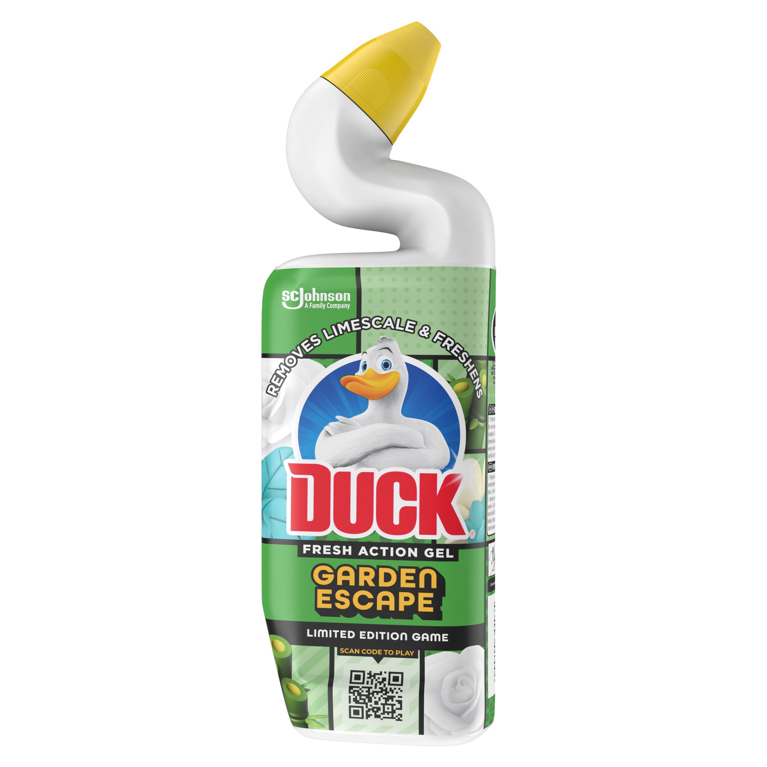 Duck® Fresh Action Gel, miris Garden Escape pruža potpuno čišćenje vaše WC školjke, ostavljajući je svježom, čak i ispod ruba. Pomaže pri uklanjanju kamenca, snažan je protiv mrlja i dopire do skrivene prljavštine ispod ruba školjke. Vaša kupaonica može postati vrtna oaza uz Duck® limited edition miris Garden Escape.