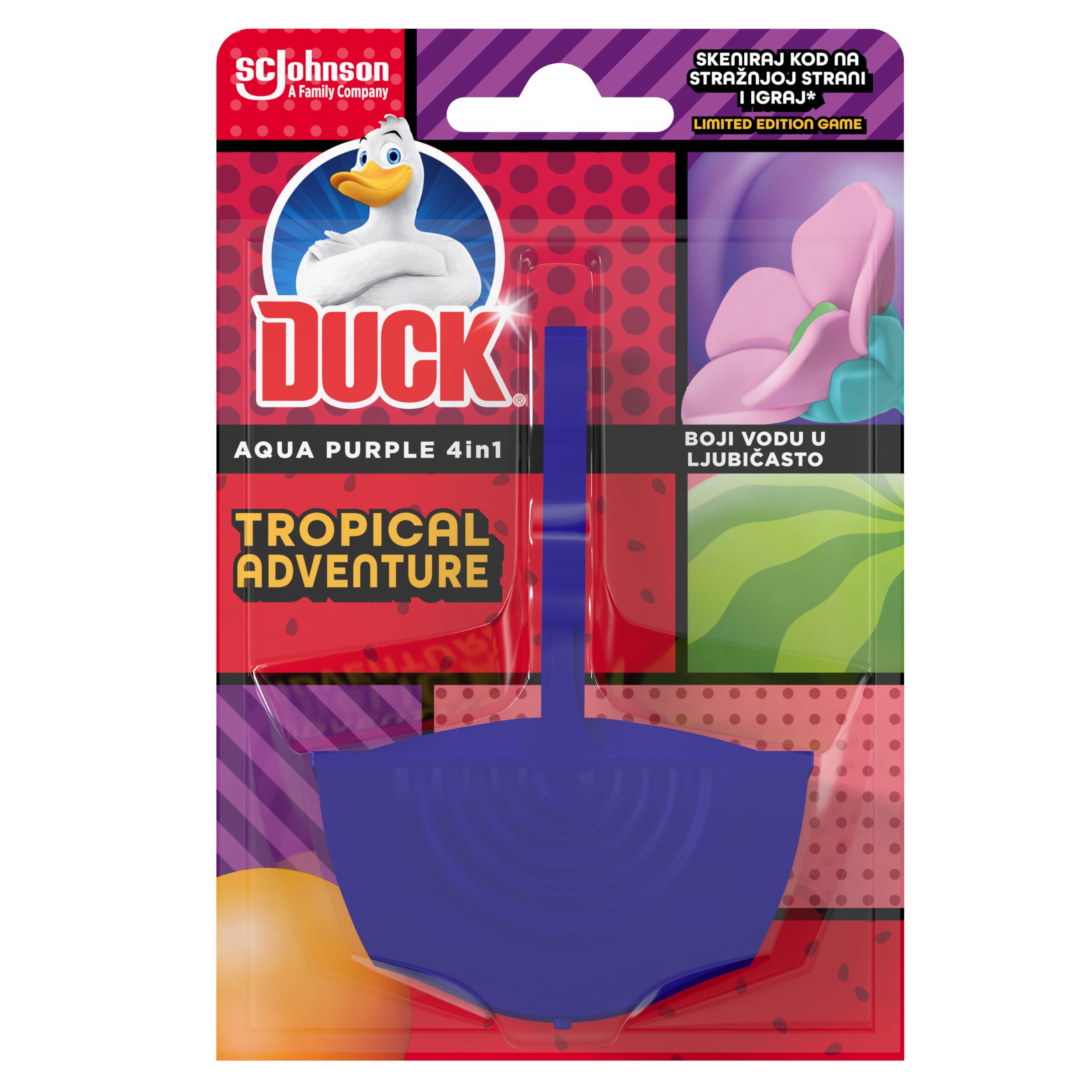 Duck® Coloring Tropical Adventure 4u1, miris Garden Escape boji vodu u ljubičasto sa svakim ispiranjem! Čisti i ostavlja površinu blistavom te pomaže u spriječavanju kamenca. Originalan oblik Duck® Aqua 4u1 košarice je posebno dizajniran kako bi omogućio jednakomjerno bojanje vode i ispuštanje svježeg mirisa sa svakim ispiranjem!