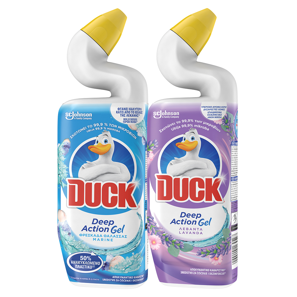 Duck® Deep Action Gel, miris marine i miris lavande dopire do skrivenih bakterija i nečistoća ispod ruba WC školjke.