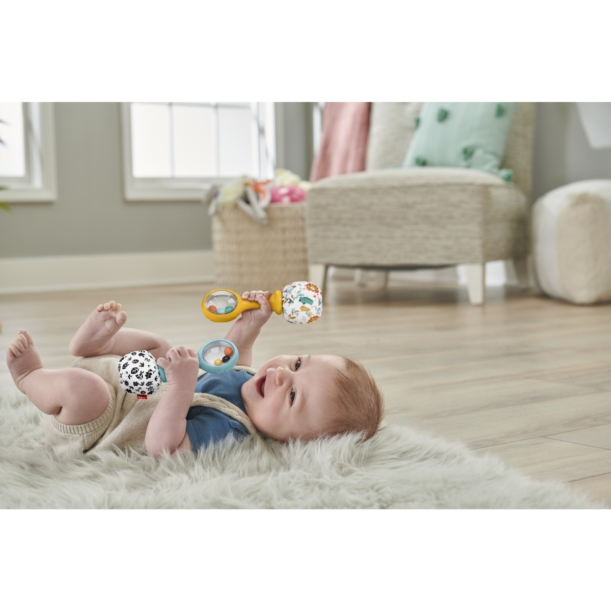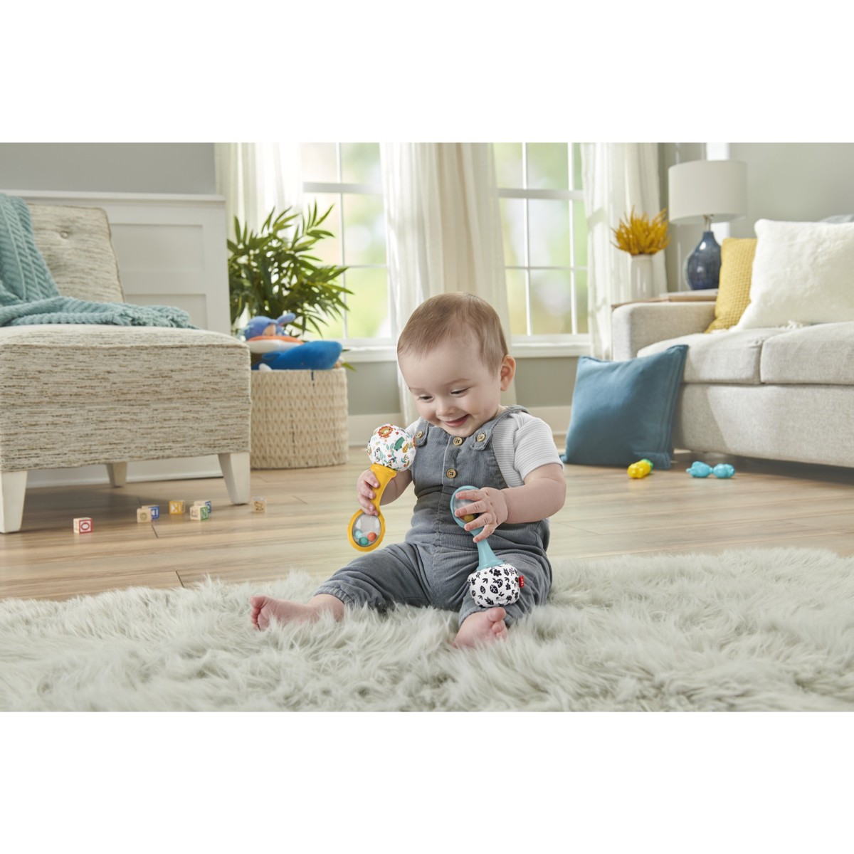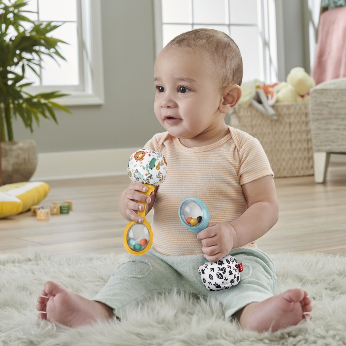 Fisher-Price® Maracas savršene su veličine za male ručice vaše bebe, omogućujući im da tresu, zveckaju i ljuljaju! Mekani, tkaninom prekriveni pomponi s uzorcima visokog kontrasta i šarene perlice koje stvaraju zabavne zvukove zveckanja potaknut će vaše mališane da ubrzo pronađu svoj ritam. Jarke boje, različite teksture i zvukovi zveckanja stimuliraju i oduševljavaju bebine osjetilne sposobnosti, dok im sva ta aktivnost tresenja i zveckanja pomaže u razvoju grube motorike.