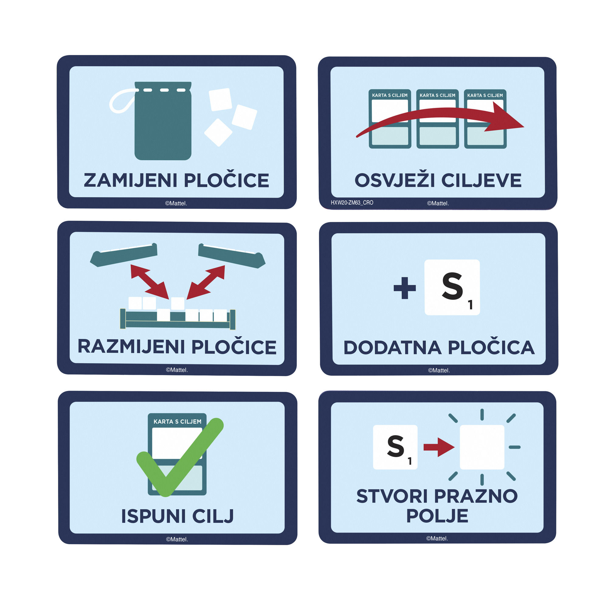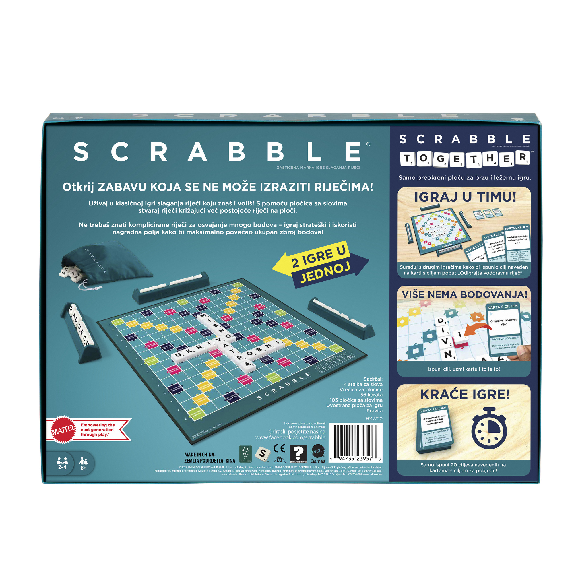 Dvije igre u jednoj! Igrajte klasični Scrabble koji poznajete i volite…ili okrenite ploču za igru i isprobajte Scrabble Together za bržu, ležerniju, timsku igru s jednostavnijim bodovanjem! U Scrabble Together igrači igraju kao tim koji mora ispuniti 20 ciljeva. Izvucite kartu i otkrijte ciljeve poput ”Odigrajte riječ od 5 slova”.