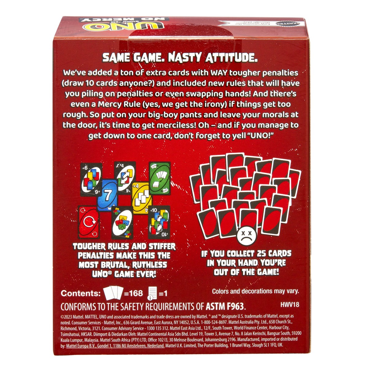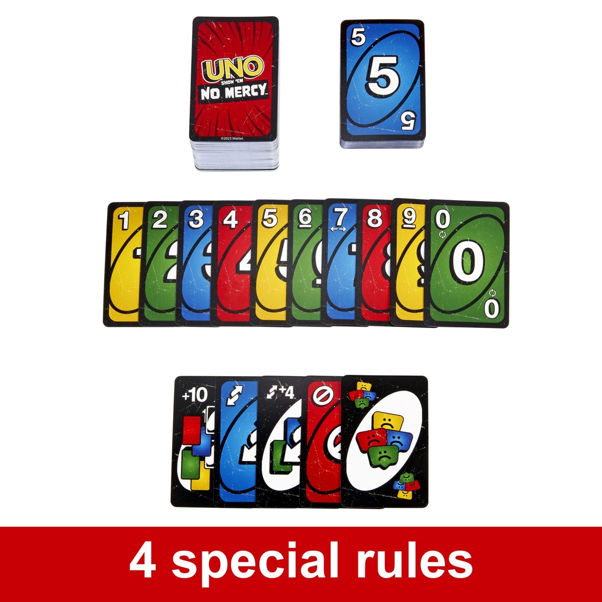 UNO Show ’em No Mercy naša je najbrutalnija UNO igra dosad! Sadrži 168 karata što je 1.5 standardnog špila UNO karata. Ima gomilu karata s PUNO strožim kaznama (je li netko izvukao 10 karata?) i novim pravilima prema kojima će igrači slagati, mijenjati i izvlačiti više karata nego ikad prije! A postoji čak i Pravilo milosrđa (da, shvaćamo ironiju) ako stvari postanu pregrube. Postoje dva načina za pobjedu u ovoj nemilosrdnoj verziji klasične igre: riješite se svih karata ILI izbacite sve ostale igrače iz igre! Oh, i ako uspijete doći do jedne karte, ne zaboravite viknuti ‘UNO!’