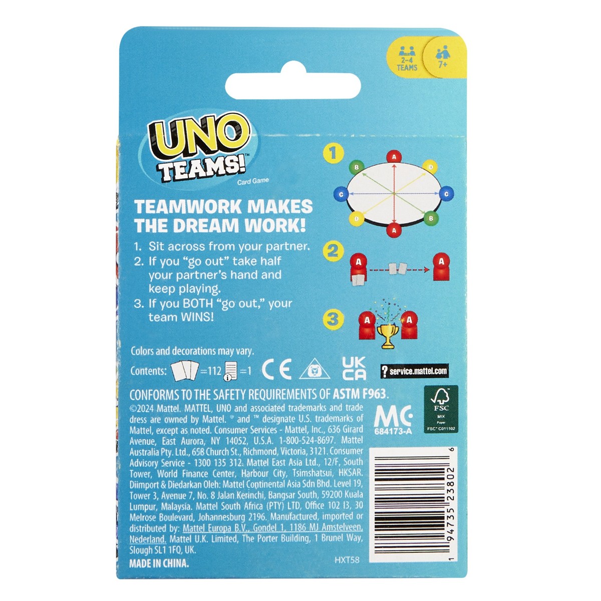 UNO Teams je novi način igranja klasične igre! Igrači i dalje spajaju boje, brojeve i simbole, ali umjesto da svatko igra za sebe, udružuju se u parove i igraju zajedno kako bi pobijedili. Posebne karte i pravila pomažu suigračima da surađuju, ali oba igrača moraju se riješiti svih svojih karata kako bi pobijedili. I ne zaboravite – kada vi (ili vaš partner!) ostanete s jednom kartom, obavezno viknite ‘UNO!’