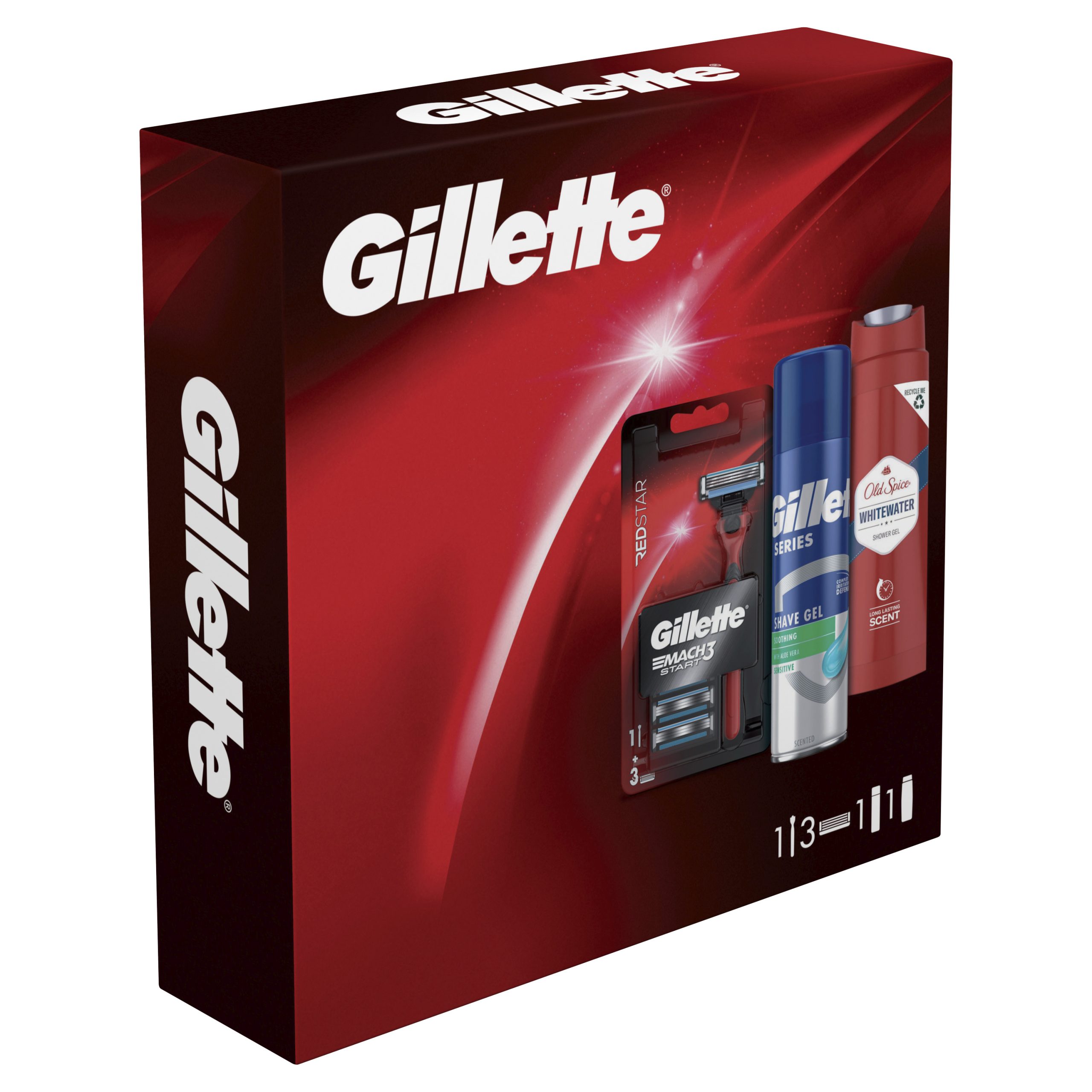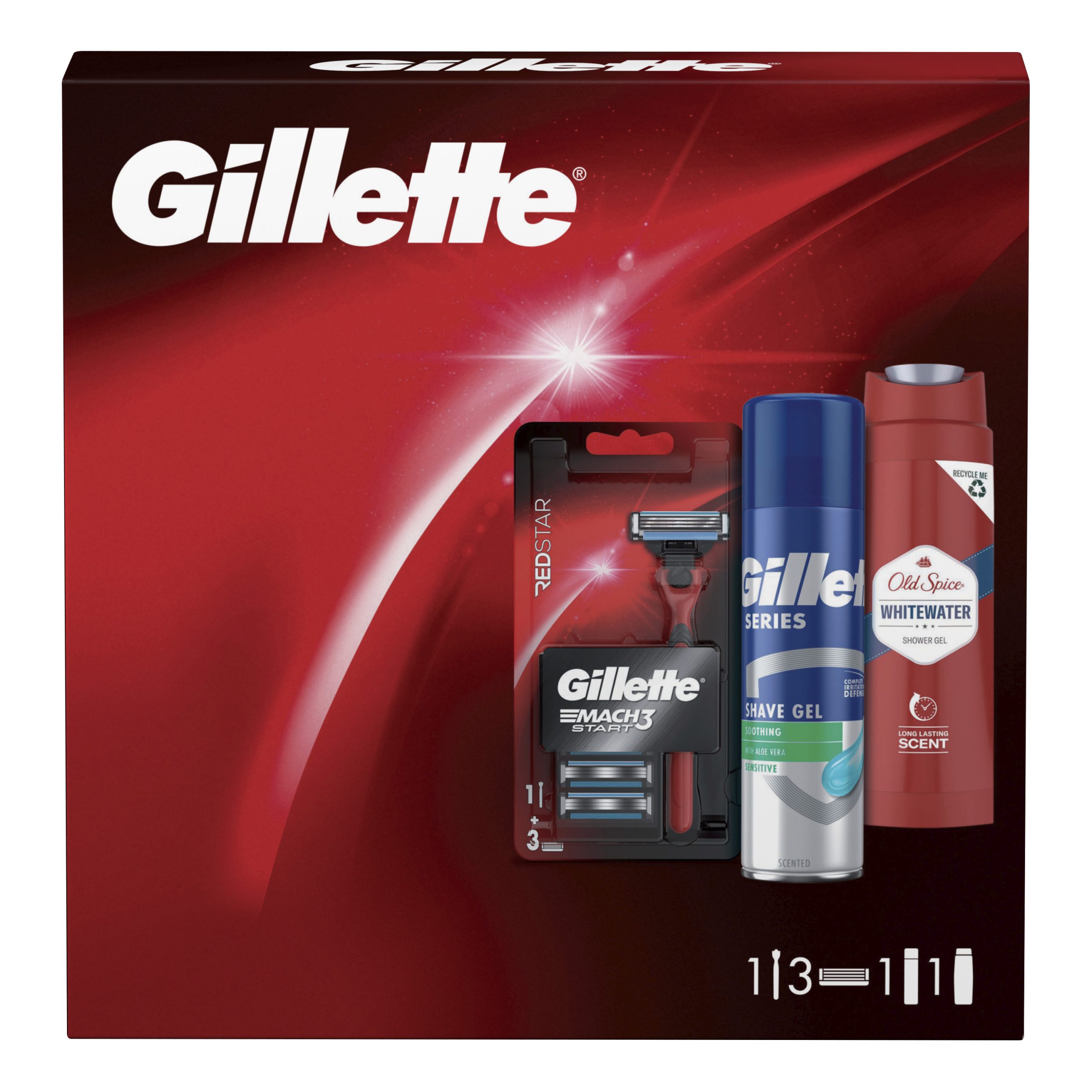 GILLETTE, poklon paket, Mach 3 brijač red + Series gel za brijanje 200ml + Old Spice gel za tuširanje White Water 200ml