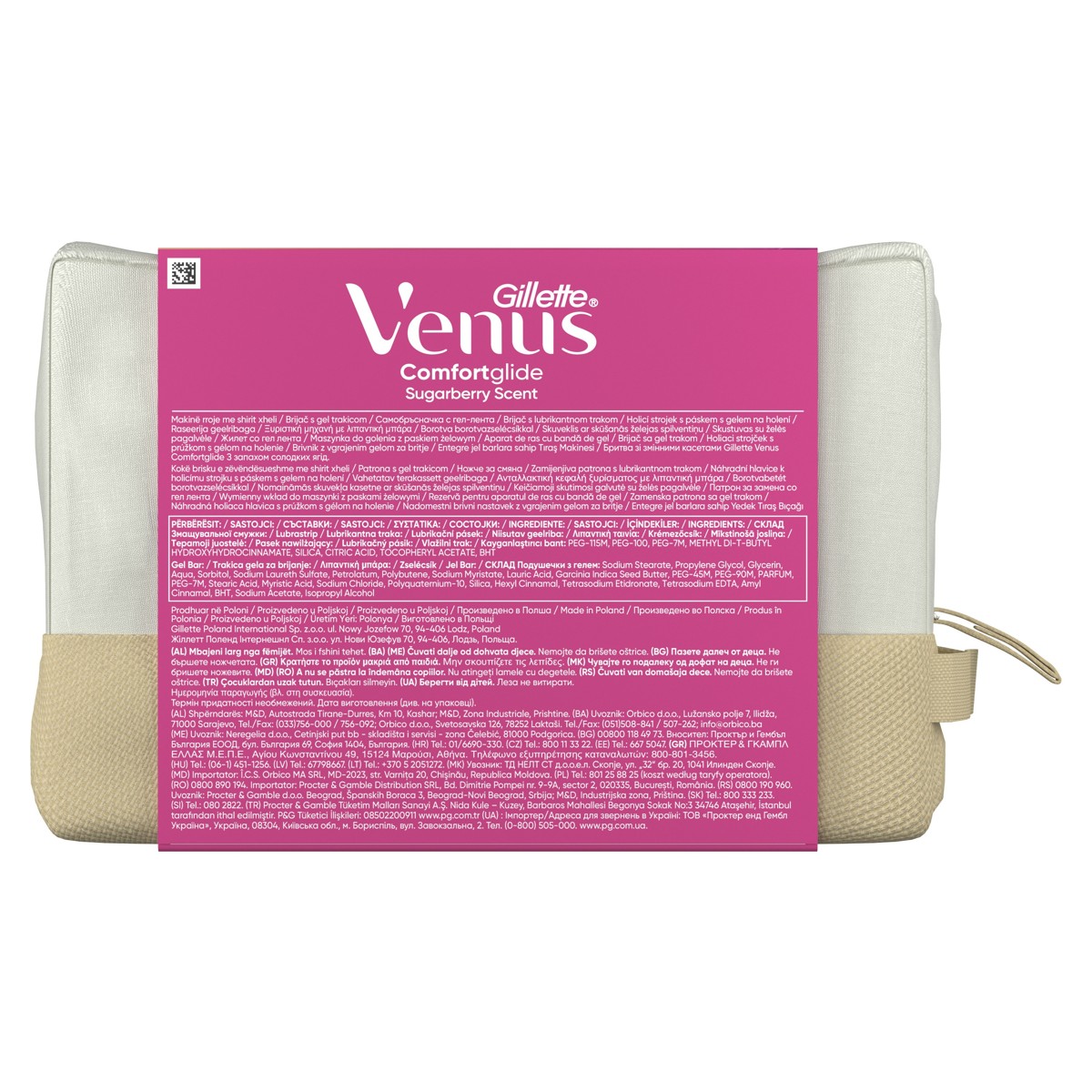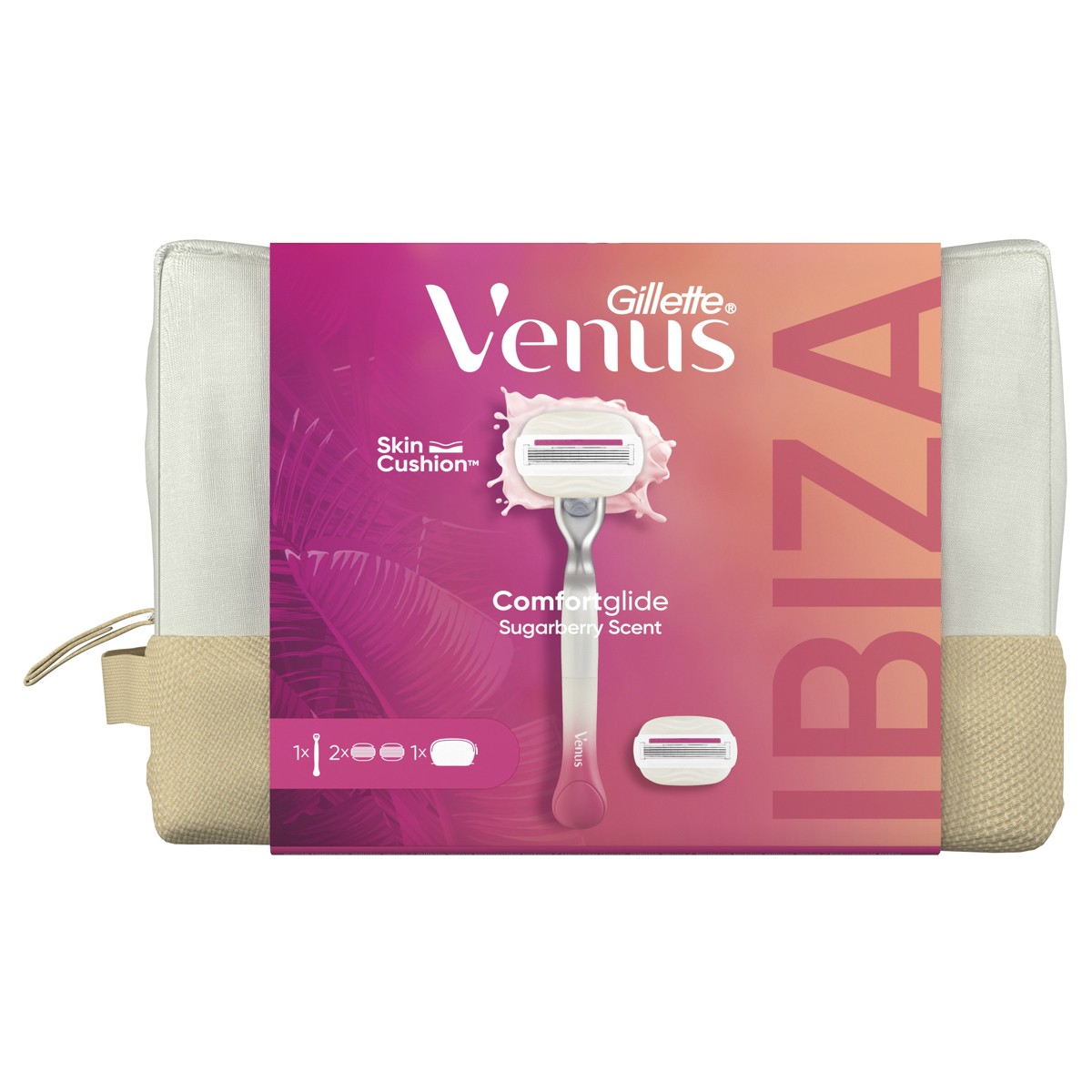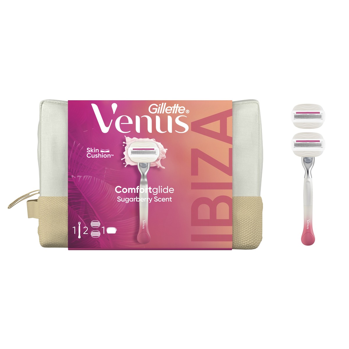 Comfortglide Festival Giftbag dolazi s britvicom zajedno s dvije punjive britvice s 5 oštrica. Venus ženske britvice dizajnirane su imajući na umu žensko tijelo. Ženski brijači Venus Comfortglide Sugarberry plus Olay imaju 5 oštrica za glatko i dugotrajno brijanje. Dodaci za oštricu britvice dolaze opremljeni Olay hidratantnim pločicama koje otpuštaju maslac za tijelo s laganim mirisom šećerne bobice, za klizanje i udobnost. S okretnim dizajnom koji se prilagođava konturama vašeg tijela, bilo koje Venus dopunsko oštrice odgovara bilo kojoj Venus dršci britvice (osim Simply Venus i Venus Pubic Hair and skin).