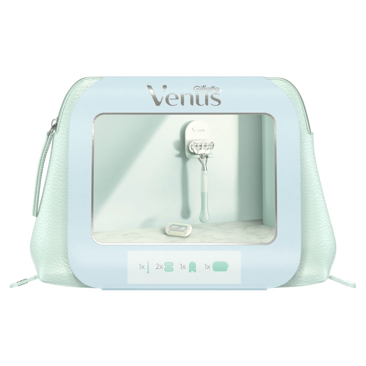 Poklon paket sadrži britvicu Gillette Venus Extra Smooth Sensitive sa posebno dizajniranom drškom, 2 zamjenske britvice, držač za tuš i kozmetičku torbicu.
