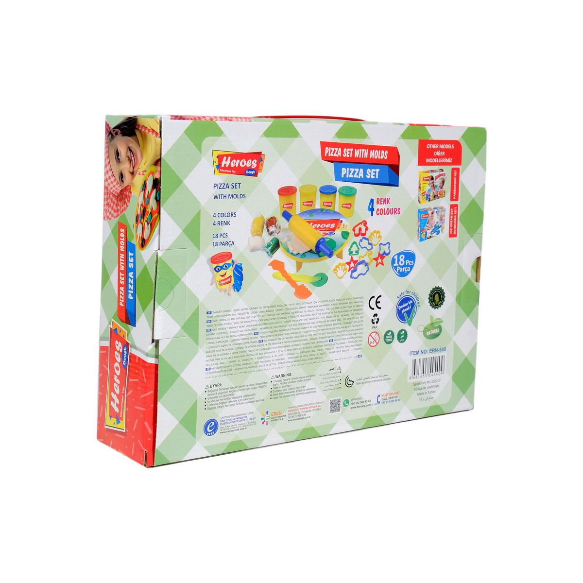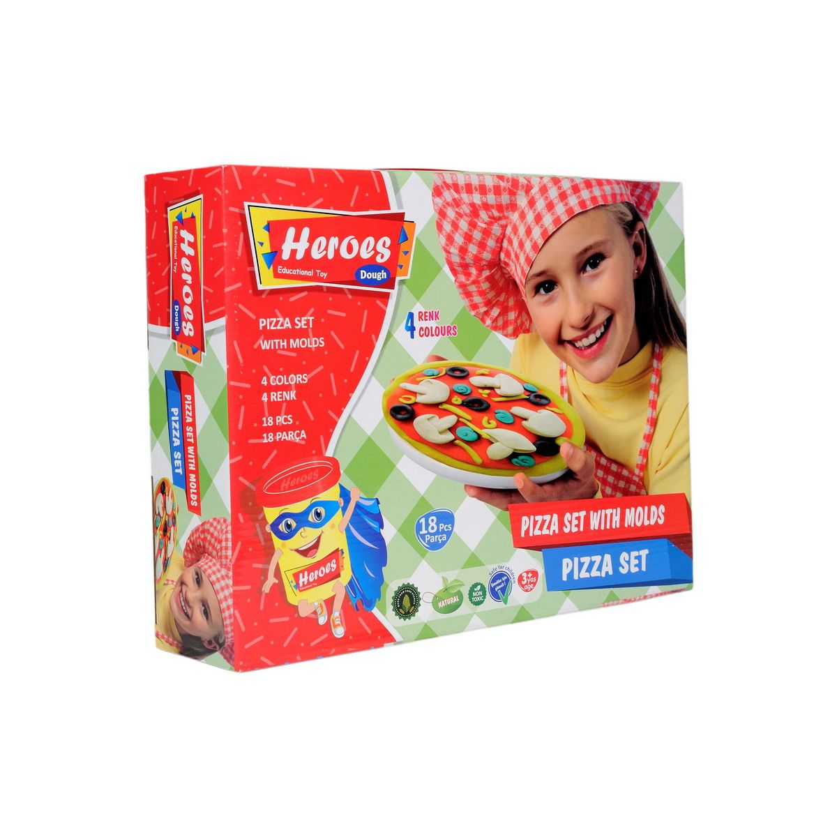 HEROES: PLASTELIN VELIKI SET – PIZZA sadrži 18 dijelova: plastelin u 4 boje, kalupe, rotirajući stol i opremu za razvijanje i rezanje „tijesta“.