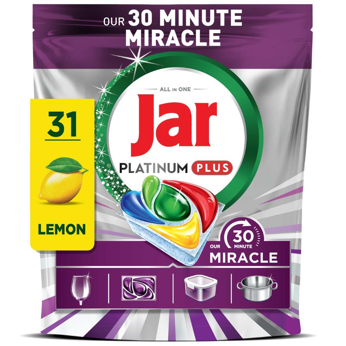 VAŠE SVE-U-JEDNOM ČUDOTVORNO RJEŠENJE ZA BLISTAVO POSUĐE BEZ PUNO TRUDA. Otkrijte Jar Our 30 Minute Miracle Platinum Plus, naše Br. 1 rješenje za čišćenje tvrdokornih ostataka hrane. Ove čudotvorne sve-u-jednom kapsule za perilicu posuđa s lakoćom postižu besprijekorne rezultate čak i na najkraćem programu te ostavljaju blag miris limuna. Imaju 5 odjeljaka s odvojenim gelovima za blistavo čisto posuđe, izniman sjaj, brzo sušenje, čišćenje filtera od masnoće i besprijekoran sjaj zahvaljujući Tehnologiji Protiv Stvaranja Mutnog Sloja. S 3x više aktivnih sastojaka za uklanjanje masnoće u odnosu na Jar Original All-in-One, uklanja tvrdokorne ostatke hrane za samo 30 minuta. Jar je djelotvoran na dugim i kratkim programima te čisti u 1. pranju bez potrebe za pretpranjem ili ponovnim pranjem. Baš kao i tekući deterdžent za pranje posuđa Jar, ali u praktičnom obliku kapsule. Uz ove kapsule za perilicu posuđa ne trebate dodavati sol za perilicu niti sredstvo za pomoć pri ispiranju. Savršen su izbor za kućanstva s puno obaveza jer pružaju brzo i besprijekorno čišćenje s učinkom namakanja preko noći. Isprobajte kapsule 30 Minute Miracle i pozdravite blistave rezultate uz Jarovu peterostruku snagu čišćenja.