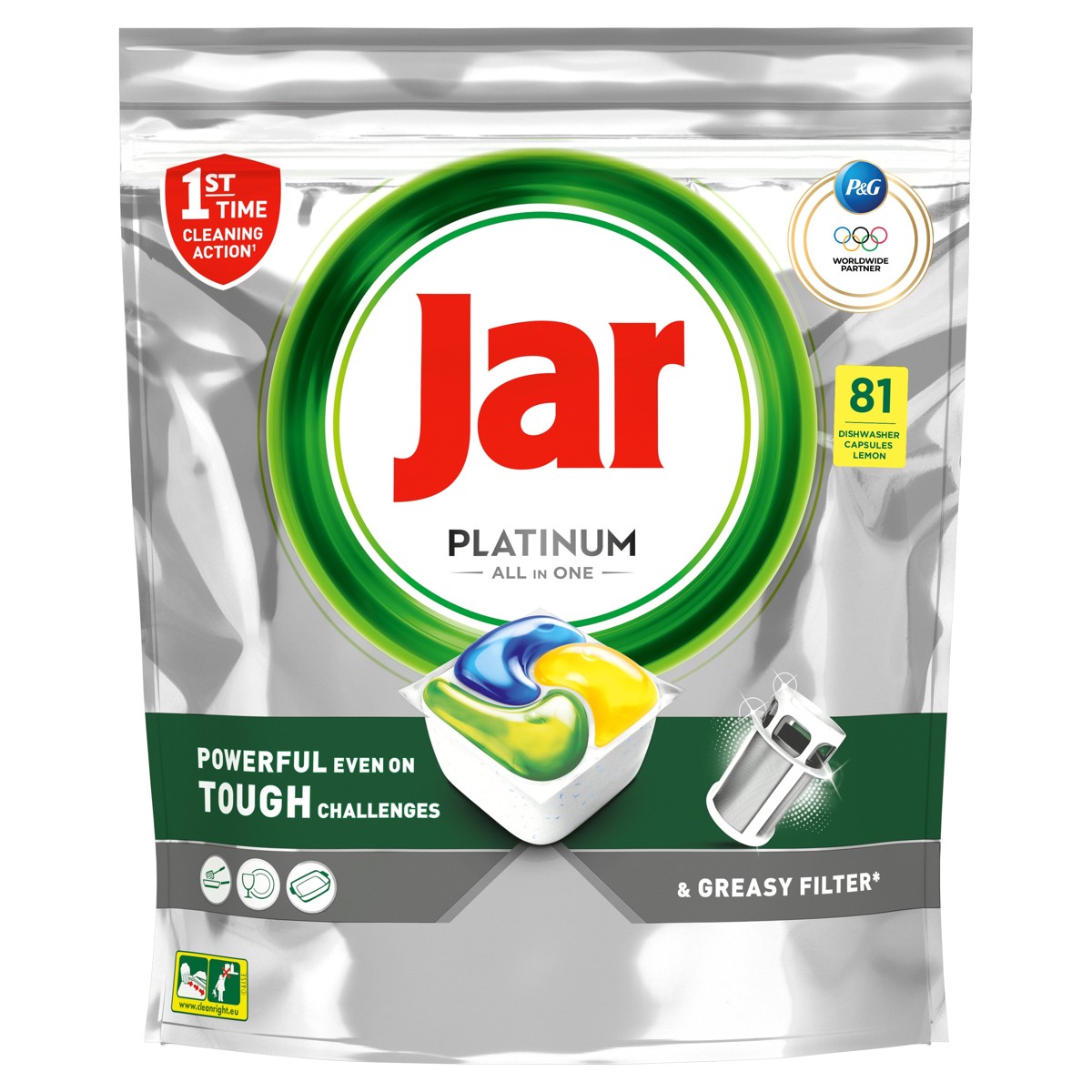 Kapsule za perilicu posuđa Jar Platinum All In One čiste u trenu i učinkovito uklanjaju čak i sasušenu masnoću, za blistavo čisto posuđe. Zahvaljujući snazi čišćenja kapsula Jar Platinum možete imati više samopouzdanja u kuhinji jer znate da će oprati čak i zamašćeni filter, ostaviti blistavo čisto posuđe i osvježenu perilicu. Jar kombinira tekućinu i prašak u jednu moćnu kapsulu. Izuzetno topiva vrećica kapsule rastapa se brzo pa odmah počinje čistiti. Ove je kapsule tako jednostavno koristiti! Ne treba im skidati omot, samo ih stavite u pretinac za deterdžent.