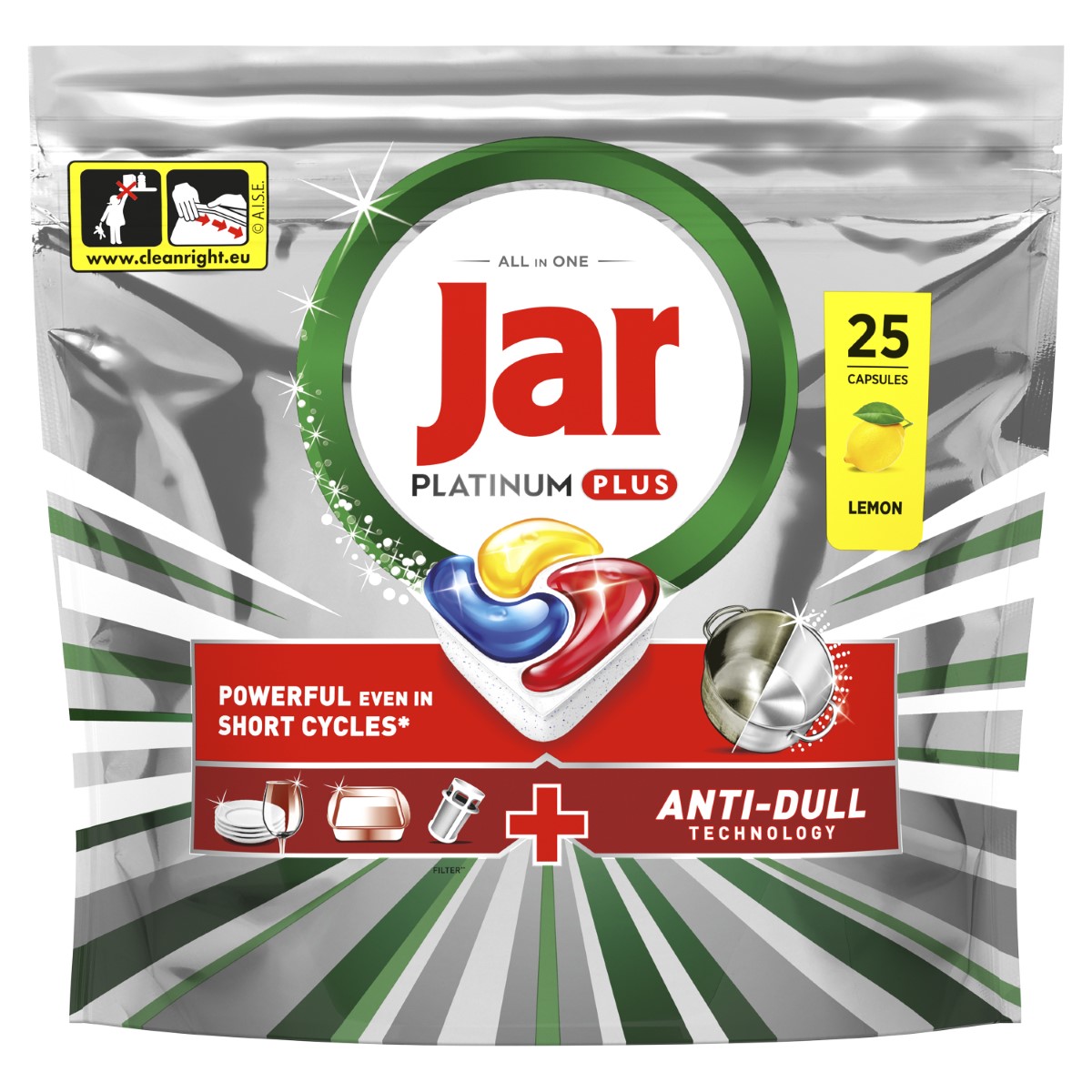 DOBIJTE VRHUNSKI ČISTO POSUĐE ČAK I NA KRATKIM PROGRAMIMA PRANJA. Otkrijte kapsule za perilicu posuđa Jar Platinum Plus All in One – vaše rješenje za besprijekorno čisto posuđe, čak i bez pretpranja. Osmišljene su da uklanjaju zahtjevne tvrdokorne mrlje, baš kao i tekući deterdžent za pranje posuđa Jar, ali u obliku praktične kapsule. Zahvaljujući tehnologiji protiv stvaranja mutnog sloja, Jar Platinum Plus uklanja mutne naslage i vraća originalan sjaj vašem posuđu. Omot kapsula Jar Platinum Plus iznimno se brzo otapa kako bi odmah počele djelovati i pružati snažno čišćenje. Kapsule kombiniraju tekući i praškasti deterdžent, izvanredno čiste i praktične su za upotrebu. Njihova snaga uklanja tvrdokornu masnoću, čak i na kratkim programima pranja (< 55-minutni unaprijed programirani program pranja). Iskusite izvanredan sjaj, djelovanje protiv stvaranja mutnog sloja i čist filter za svježu perilicu posuđa. Upotreba ovih kapsula za perilicu posuđa nevjerojatno je jednostavna jer sadrže sol i sredstvo za pomoć pri ispiranju perilice posuđa. Rukujte kapsulama samo suhim rukama. Dobro zatvorite ambalažu nakon svake upotrebe.