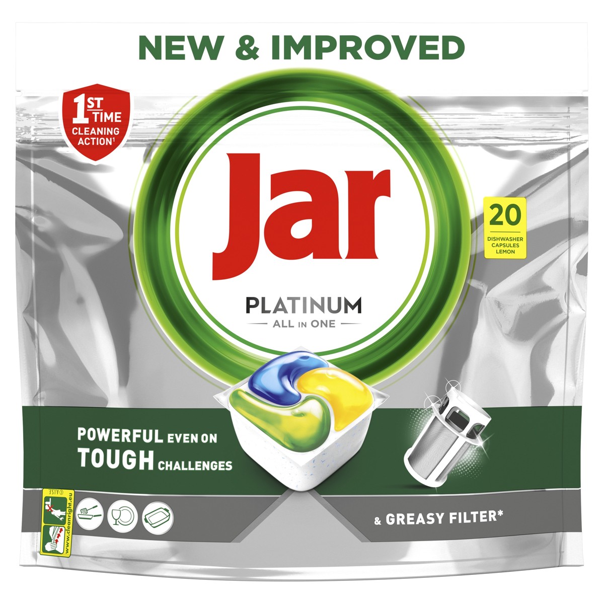 Kapsule za perilicu posuđa Jar Platinum All In One čiste u trenu i učinkovito uklanjaju čak i sasušenu masnoću, za blistavo čisto posuđe.