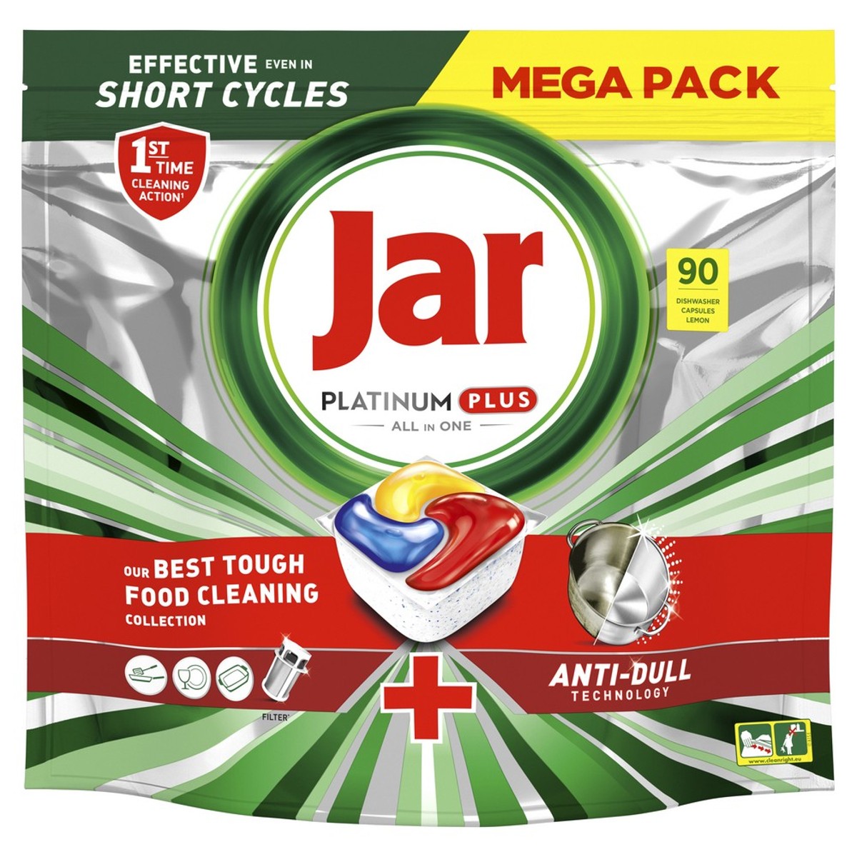 Kapsule Jar Platinum Plus All in One, za posuđe čisto kao da je novo. Najmoćniji Jarov deterdžent pomaže ukloniti mutni sloj koji se nakuplja tijekom vremena i vraća originalan sjaj vašem posuđu.