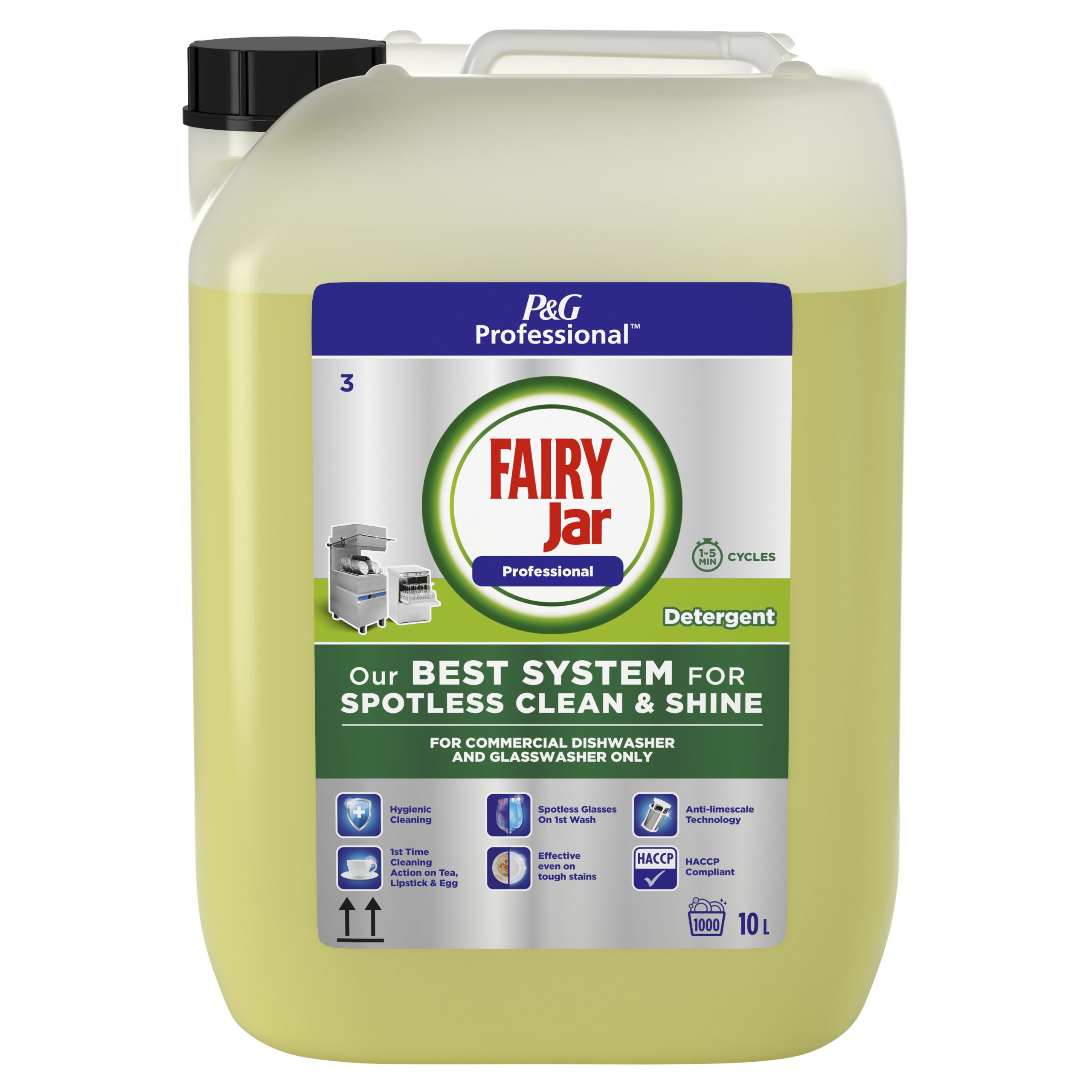 Koncentrirani deterdžent Jar P&G ProfiLine namijenjen je pranju posuđa u profesionalnim perilicama posuđa s kratkim ciklusom (ciklus pranja 1-5 min) i automatskim doziranjem. Posebno je razvijen za profesionalne operacije. Kombinacija visoko alkalnih i surfaktanata sprječava teške naslage. Trenutačno uklanja tvrdokorne mrlje poput škroba i proteina. Pomaže u sprječavanju nakupljanja kamenca na tanjurima i staklu na svim razinama tvrdoće vode.