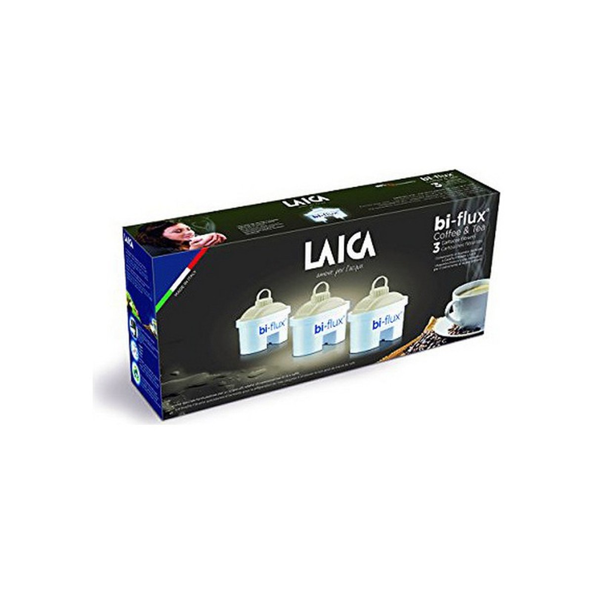 Laica Bi-flux Coffe&Tea je umetak za filter vrčeve s posebnom formulacijom namijenjenoj pripremi čaja i kave. Bi-flux Coffe&Tea smanjuje tvrdoću vode i čuva mineralne soli koje su korisne za tijelo. Također smanjuje kemijske zagađivače, teške metale i klor koji mogu biti prisutni u vodi. Uložak također održava kontrolirani pH vode za poboljšanje okusa čaja i kave.