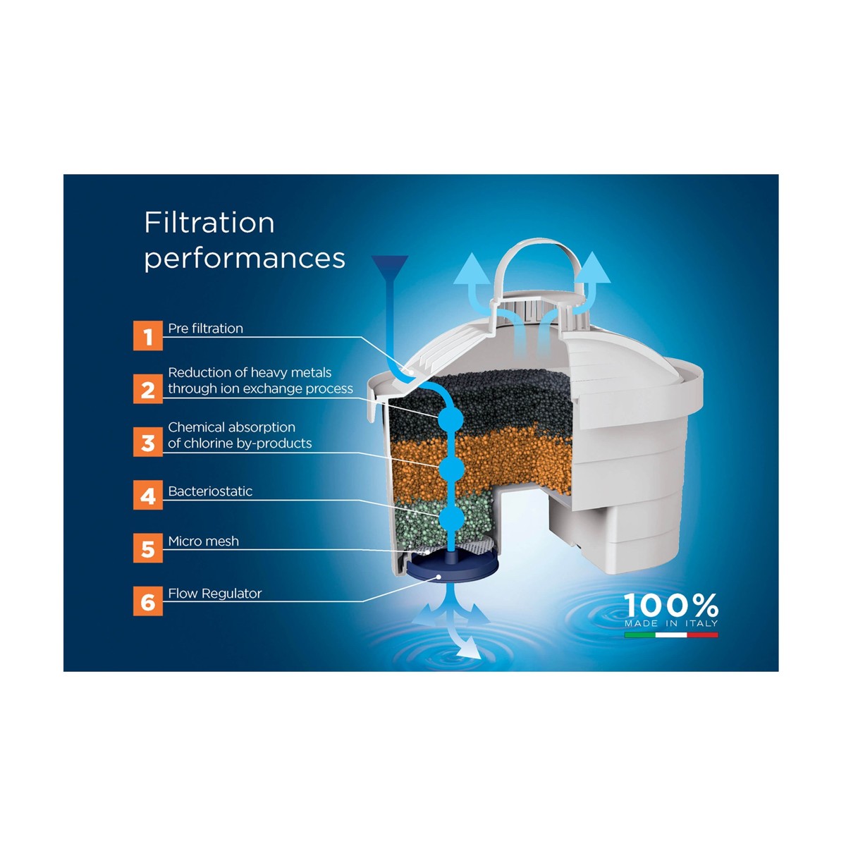 Laica bi-flux filter smanjuje sadržaj klora, kamenca, teških metala, herbicida, pesticida. Svojom inovativnom formulom održava prirodnu ravnotežu mineralnih soli u vodi iz slavine od kalcija i magnezija.