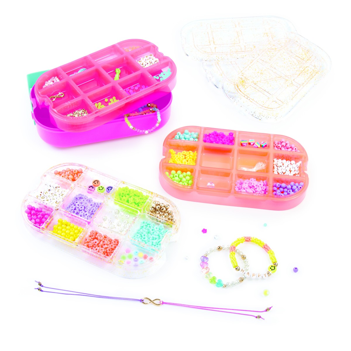 Kreativnost uvijek pri ruci! Ova praktična kutija omogućit će ti da perlice budu uredno posložene i organizirane tijekom kreativnih trenutaka izrade nakita. Posebno oblikovane ladice pomažu pri slaganju uzoraka perlica, mjerenju duljine konca i organiziranju odabranih perlica za nizanje.