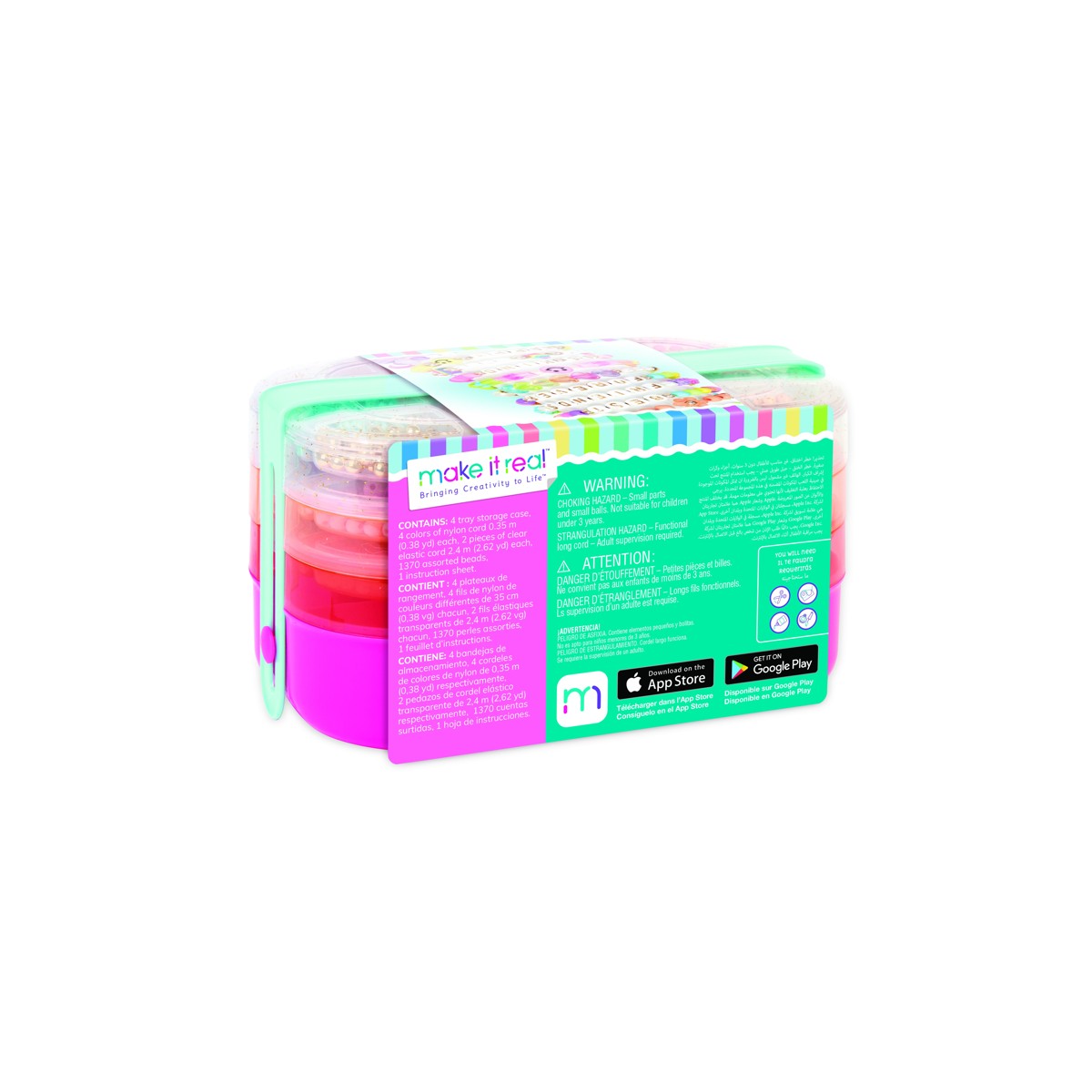 Set sadrži: 4-dijelnu kutiju za pohranu, 4 boje najlonskog konca (0,35 m svaki), 2 komada prozirnog elastičnog konca (2,4 m svaki), 1370 raznolikih perlica, 1 list s uputama